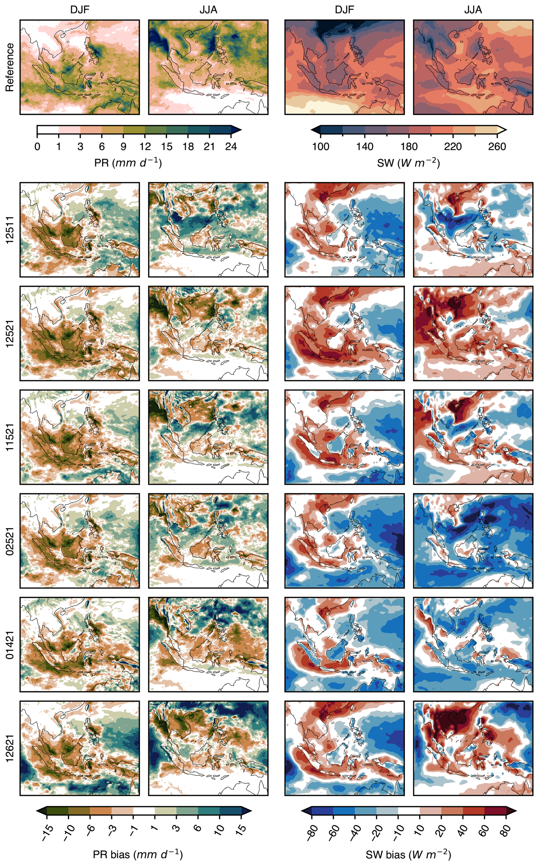 Figure 5 illustrates the subset's spatial performances for PR and SW, taking IMERG and EBAF as references, respectively. Observed seasonal patterns (in DJF and JJA) are displayed in the first row, above bias maps of the six selected experiments. PR and SW subregional annual cycles are shown in the first two rows of Fig. 6.
