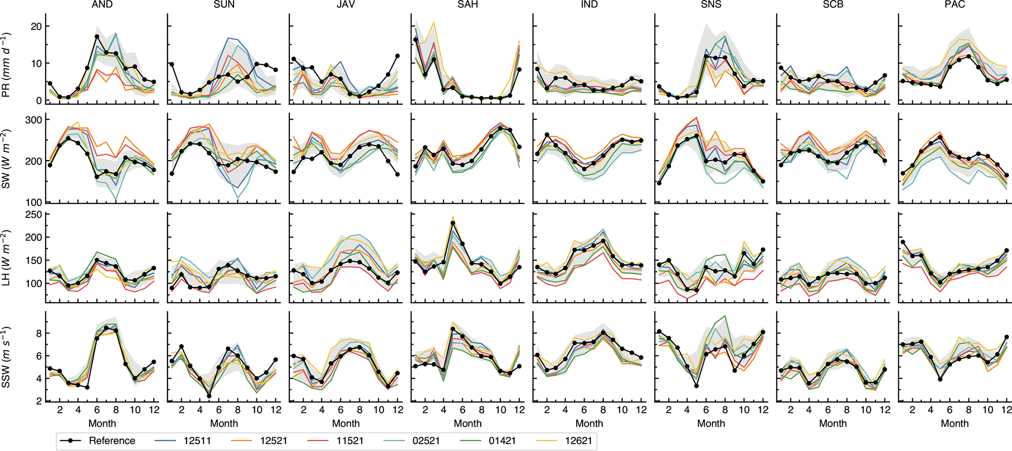 Figure 6Monthly annual cycles of PR, SW, LH and SSW (rows) over the eight subregions (columns), according to the subset of six experiments and to four reference datasets, respectively IMERG, EBAF, ECMWF and WindSat. Gray areas show the envelope of the 36 experiment ensemble mean plus or minus one ensemble standard deviation.