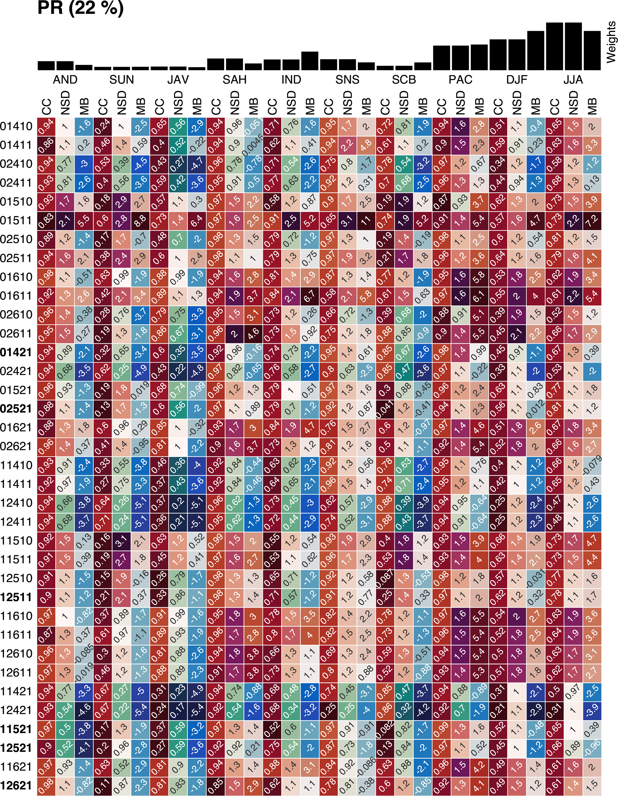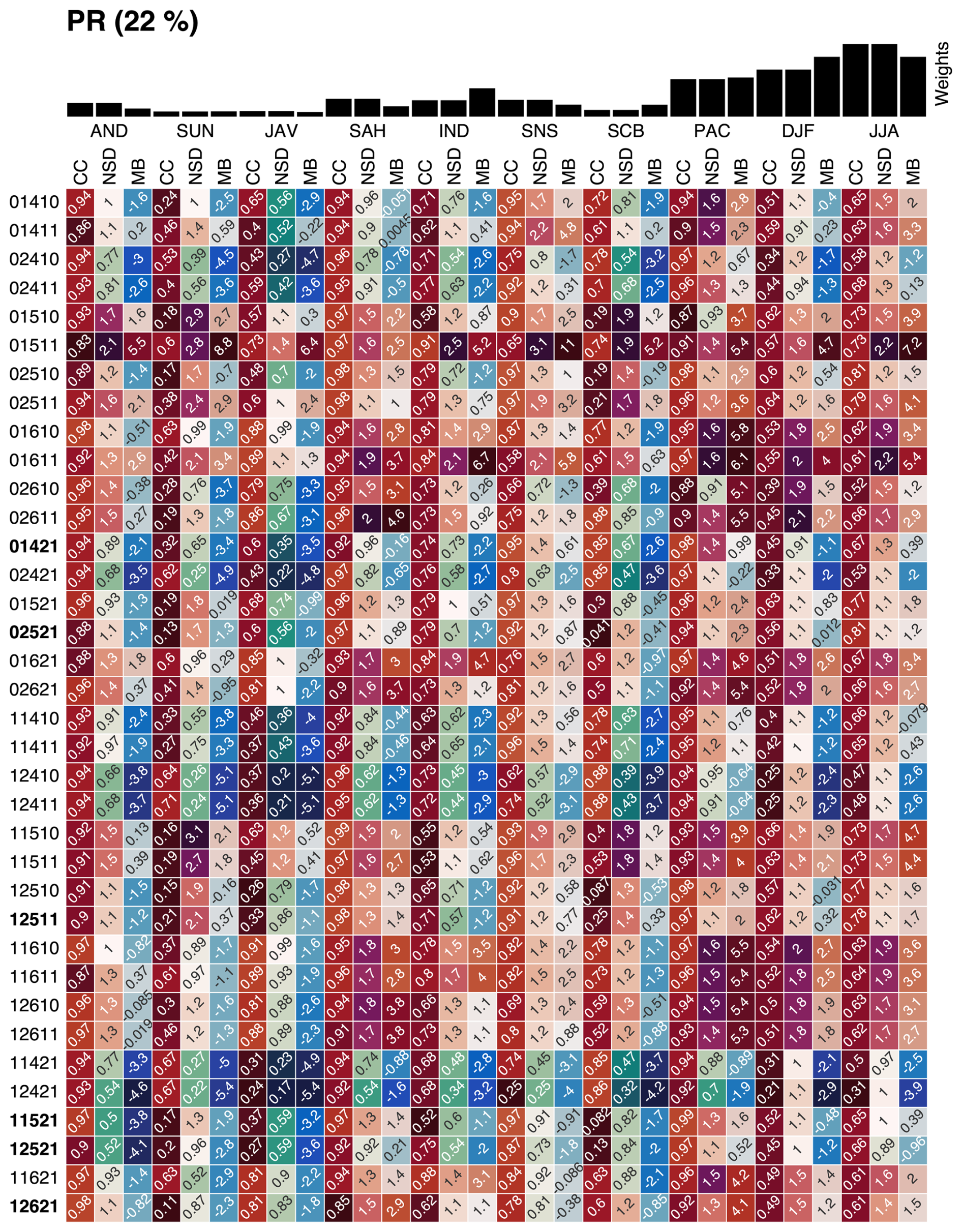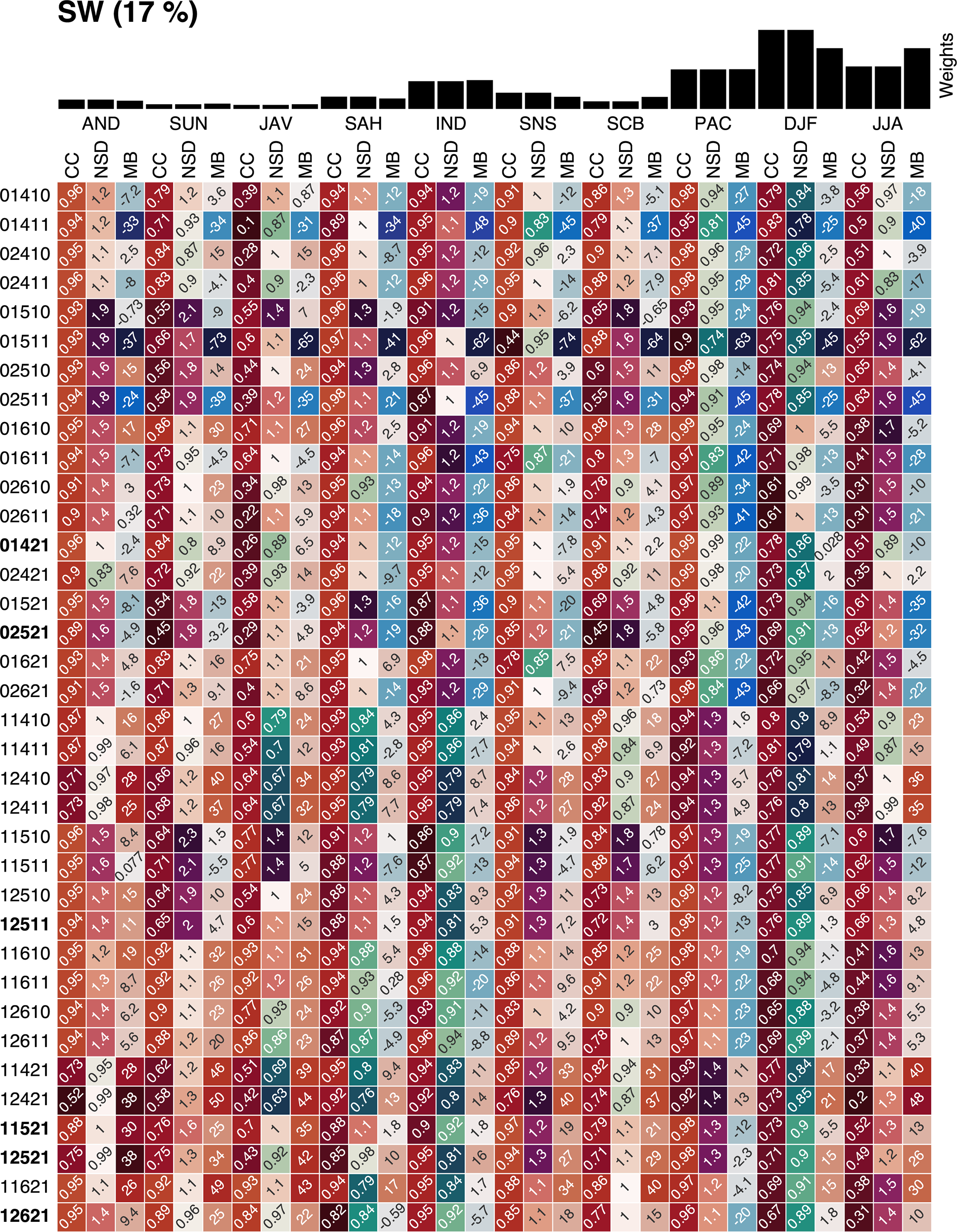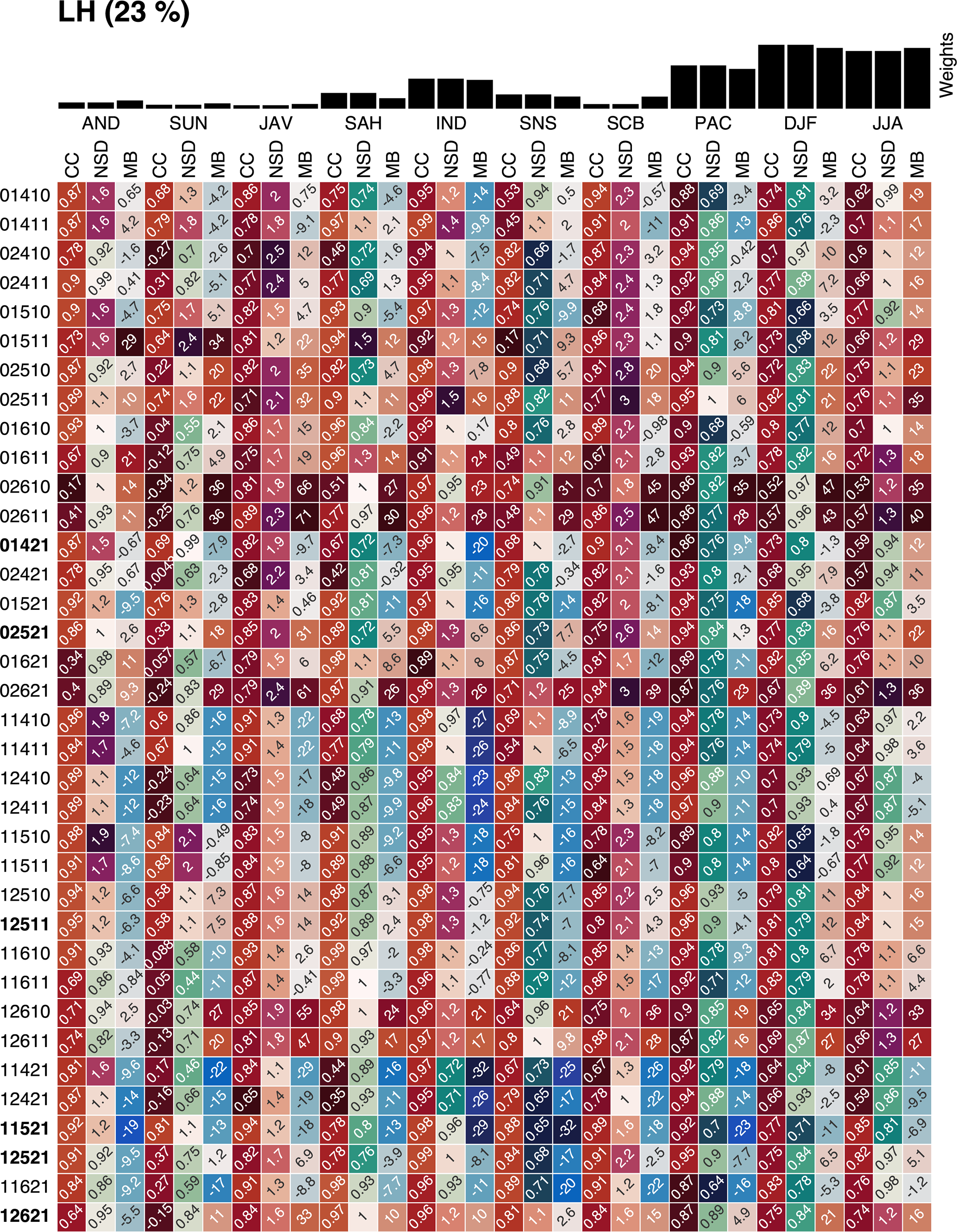 For other variables' subscores (Fig. 3a–c), mean value is the aspect separating the ten-to-fifteen lower scores from the others. In the upper half of the rankings, assessment of the mean value yields similar results, and score differences stem elsewhere: in the spatial variability branch for PR (though much lighter than for SSW); in the temporal variability branch for SW; and in a combination of both for LH.