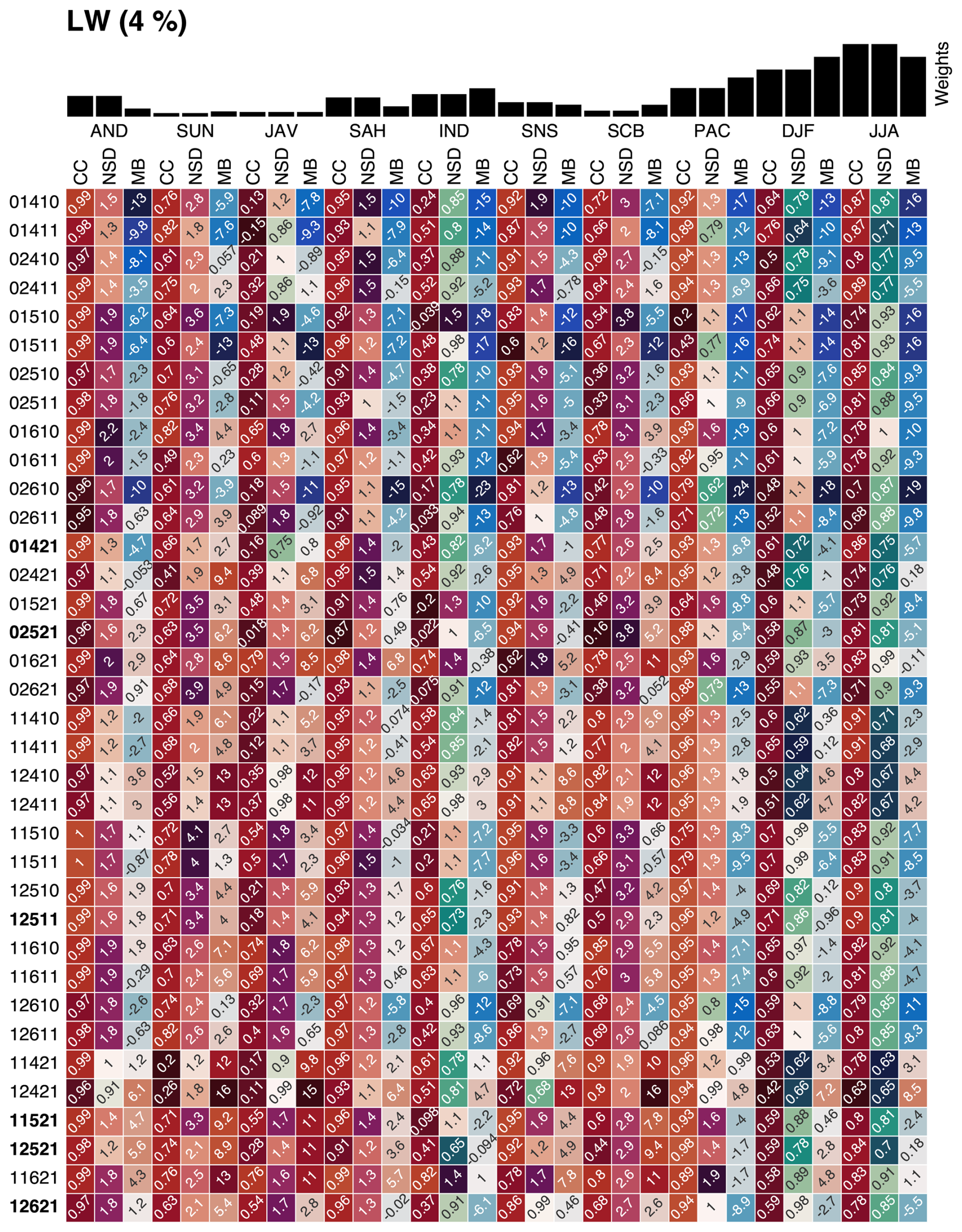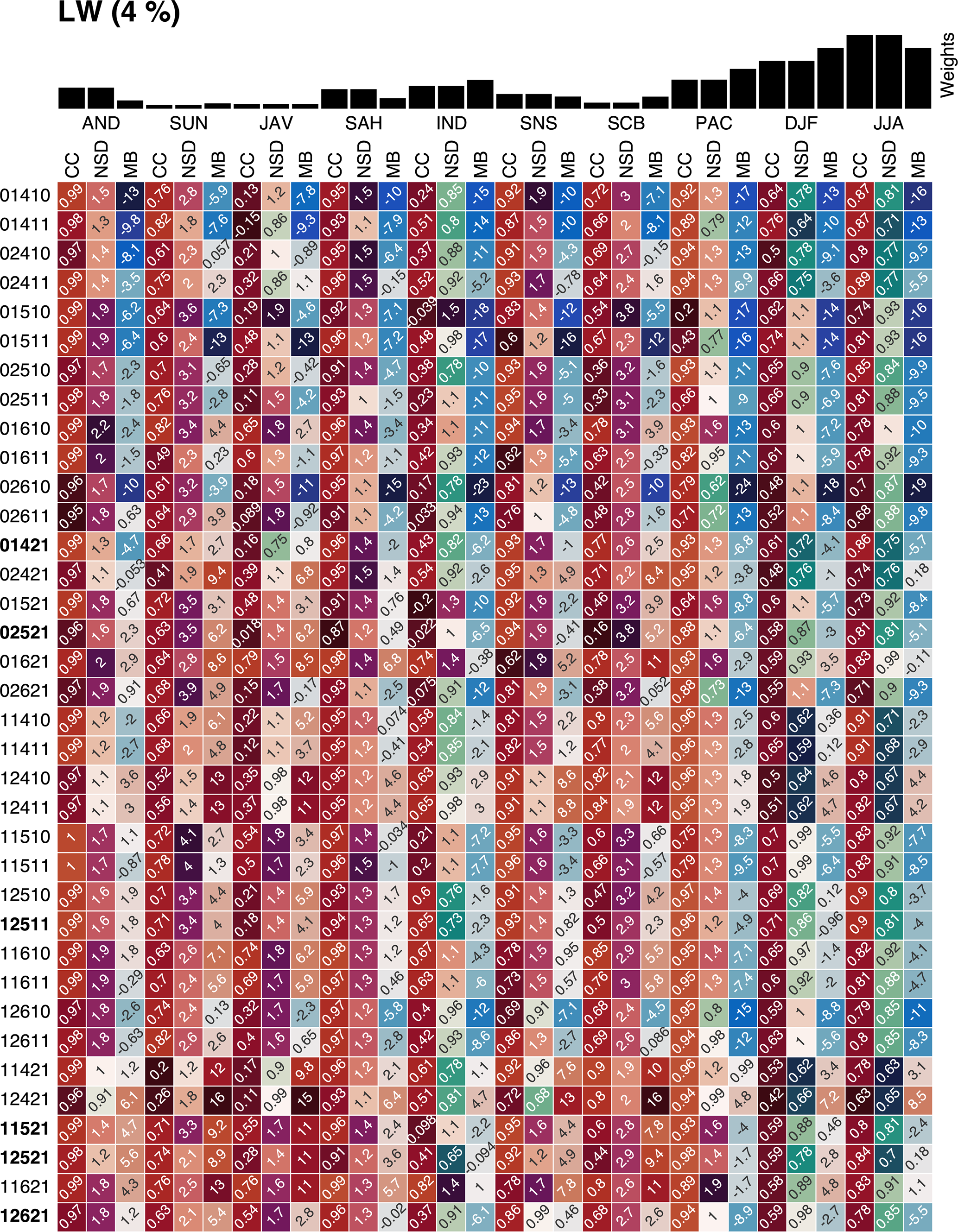 LH and SW are the two biggest contributors to the heat flux scores (Fig. 3a and b). Grayscale markers emphasize the low correlations of these variable scores with the aggregate results, equal to 0.63 and 0.37, respectively, relative to about 0.88 for both PR and SSW (Fig. 3f). Furthermore, the correlation between LH and SW scores is 0.32: in addition to the fact that the ensemble is harder-to-rank for these variables individually, with score SDs of 0.85 and 0.82, respectively, the two scores tend to offset each other, explaining our first observation on the low influence of the heat flux scores on the final results. Only five configurations rank among the top 10 in both rankings, including notably 02421 and 02410 which both use CCM3, UW-PBL and MIT () and get the highest heat flux contributions to their aggregate scores. Besides, many configurations show very different relative performance at simulating both variables, such as 02610 and several other UW-PBL/Kain–Fritsch experiments () which perform much better with SW than with LH.