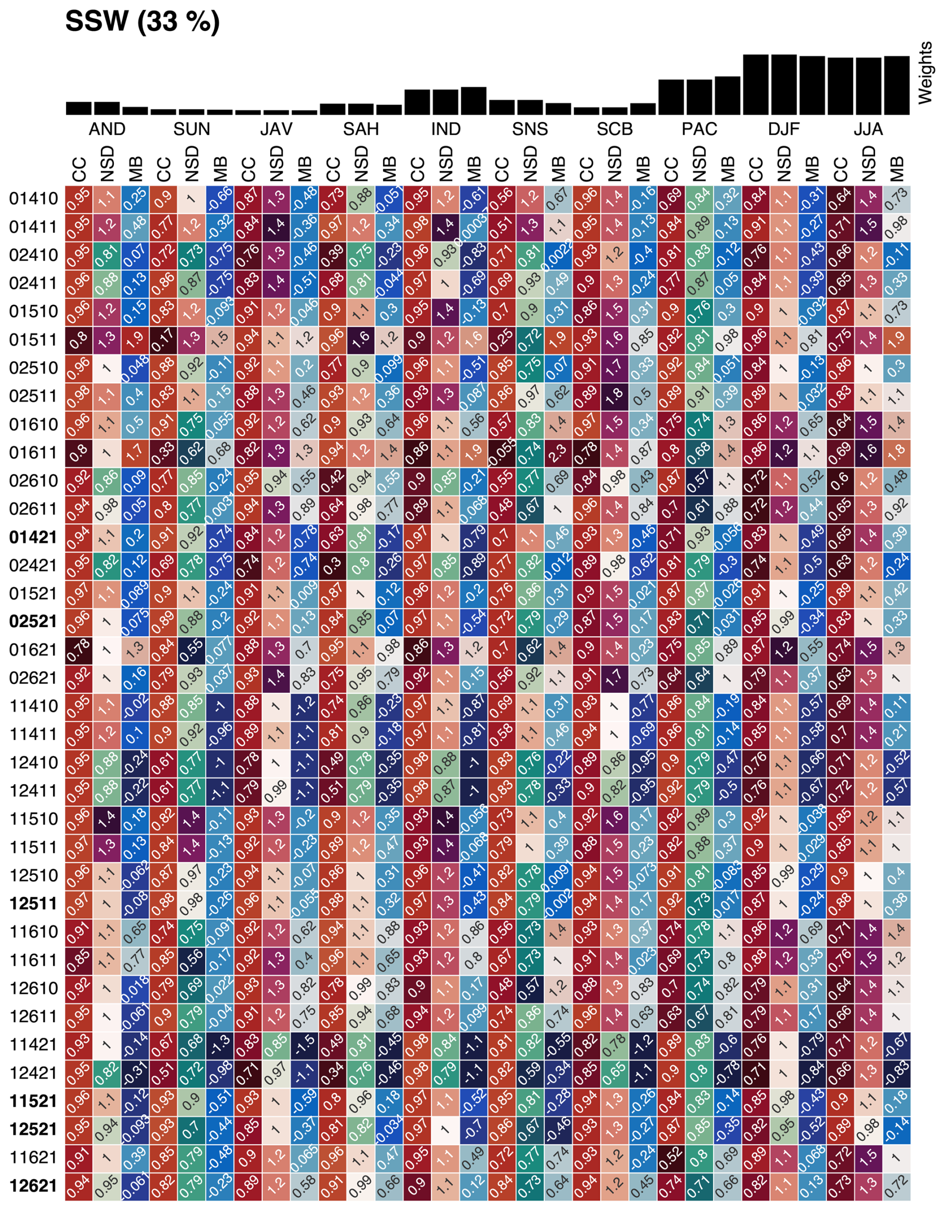 In this context, if one now had to choose one single variable among those we selected to determine a subset of best-performing experiments in the region, one would likely choose PR – hence emphasizing experiment 02521 (Fig. 3c) – since the ensemble produces the widest range of patterns for this aspect of the climate (i.e. low similarity). Reversely, without comprehensively examining each SSW outputs, the similarity results for this variable indicate that most experiments “agree” on the related patterns – whether this generally corresponds to “good” performances or not – thus one would likely not consider better performances in simulating SSW as relevant configuration-picking criteria. Although this similarity analysis brings valuable insights into our problem, variable weights remain unclear to define. In this respect, we highlight the importance of considering each variable ranking individually, and not exclusively consider the aggregate scores which partly rely on arbitrary weights.