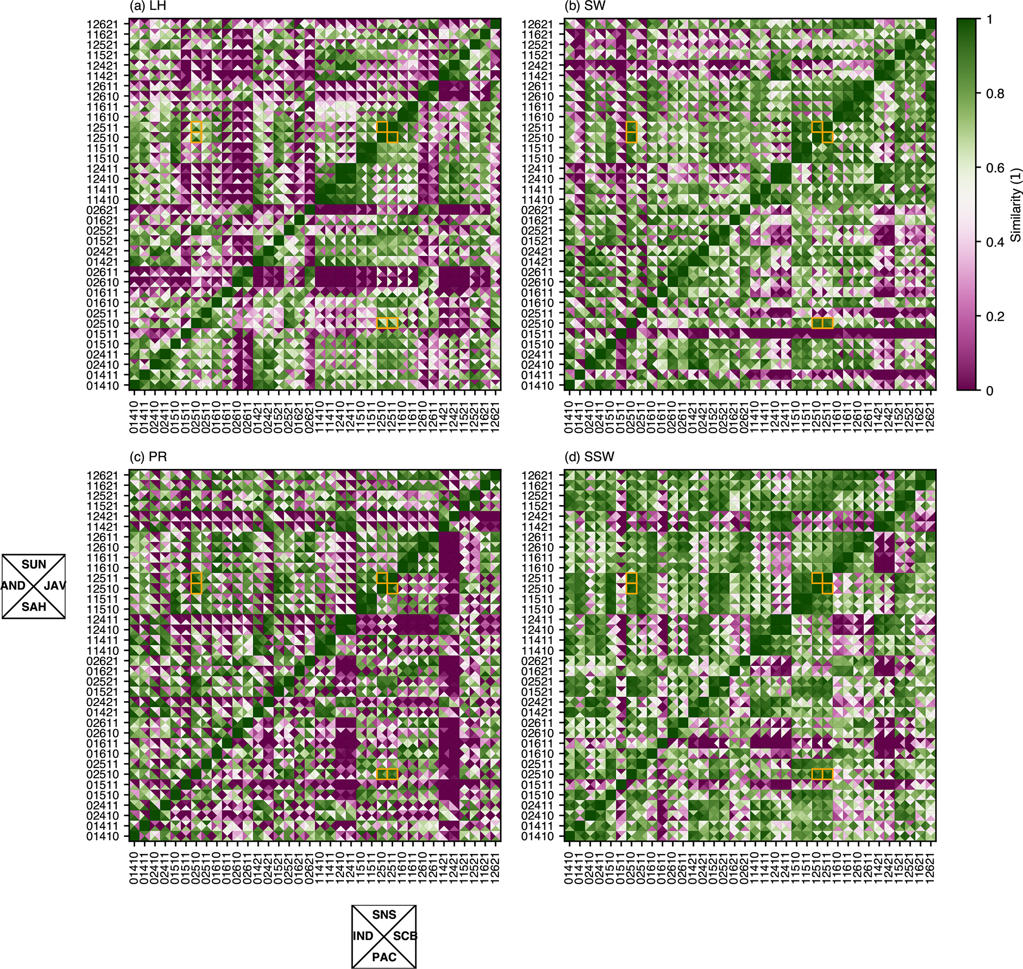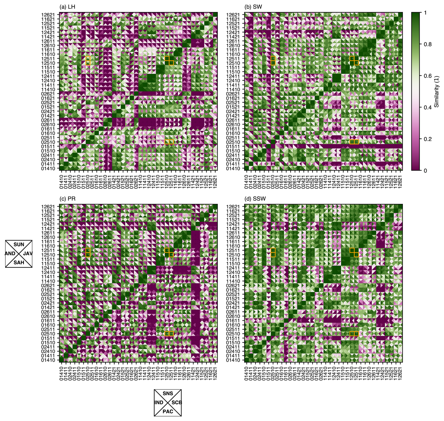 Figure 4a–d shows the spatial distribution of temporal similarity for the four variables we focus on, i.e. LH, SW, PR and surface wind (the map in Fig. 4d including both land surface wind and SSW). We can note the generally lower similarity along the Equator – quite characteristic of SEA (Ngo-Duc et al., 2017; Desmet and Ngo-Duc, 2021) –, several zones of high dissensus over the SEA seas for LH, and a softer similarity minimum in the northern Philippine Sea for surface wind. For PR, disagreement is particularly more widespread.