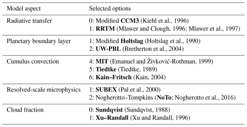 In Sect. 2.2 we present the protocol and methods ruling the sensitivity experiments we then conduct, varying the choices made for five model aspects. These five aspects and the candidate options we select are listed in Table 1. The cumulus convection schemes simplified Kuo (Anthes et al., 1987) and Grell (Grell, 1993) are not considered due to their generally poorer performance in RegCM sensitivity studies over SEA (e.g. Sinha et al., 2013; Zhang et al., 2015; Gao et al., 2016; Juneng et al., 2016; Li et al., 2016; Maity et al., 2017). We also exclude the WRF-Single-moment-Microphysics 5-class (WSM5; Hong et al., 2004) option for the resolved-scale microphysics, because preliminary tests with the setups presented in Giorgi et al. (2023) adapted to our domain and resolution did not yield satisfactory results, based on the criteria described in Sect. 2.2 (not shown). Besides, the NoTo microphysics will only be associated with the Xu–Randall cloud fraction, as done in Nogherotto et al. (2016; spurious cloud amounts appear when combining NoTo with the Sundqvist cloud fraction). As a result, all considered options reported in Table 1 make 36 possible physical scheme combinations.