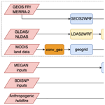 To meet these needs, UI-WRF-Chem is designed to operate in both forecasting (or near real time, NRT) and reanalysis modes. We use the NASA GEOS model data: GEOS FP in forecasting or NRT mode and MERRA-2 in reanalysis mode to drive WRF-Chem simulations by providing self-consistent and unified meteorological and chemical initial and boundary conditions, referred to as the Unified Inputs (of initial and boundary conditions) for meteorology and chemistry. Figure 1 presents the flowchart of the UI-WRF-Chem modeling framework. Here, we provide a brief description of the UI-WRF-Chem framework, outline the components included in the standard WRF-Chem model and highlight the major updates we have introduced.
