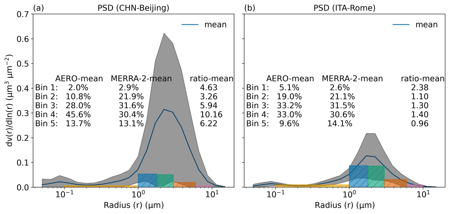 Lastly, we have developed a method to constrain the chemical boundary condition for the allocation of dust concentration in the MERRA-2 data as a function of different dust size bins. While assimilating satellite-derived aerosol optical parameters can improve the simulation of dust in MERRA-2 data, uncertainties remain in simulating the dust size distribution from emission sources and along the transport pathway in the MERRA-2 data (Kramer et al., 2020). These uncertainties are particularly evident during long-range dust transport events, due to factors such as the deposition process and the quality of satellite data being assimilated (Zhu et al., 2025). To address this, we have developed a method to further constrain the MERRA-2 simulated dust size distribution with AERONET observation, which can be incorporated into the chemical boundary conditions for simulating the impacts of dust transport on the domain of interest. This method is applicable in regions where AERONET sites with long-term data are available. We compare the dust particle size distribution (PSD) from MERRA-2 data with AERONET observations to improve the allocation of dust concentration into different size bins in the chemical boundary conditions. A detailed description and application of this approach are provided in Sect. 4.1 and 4.2.