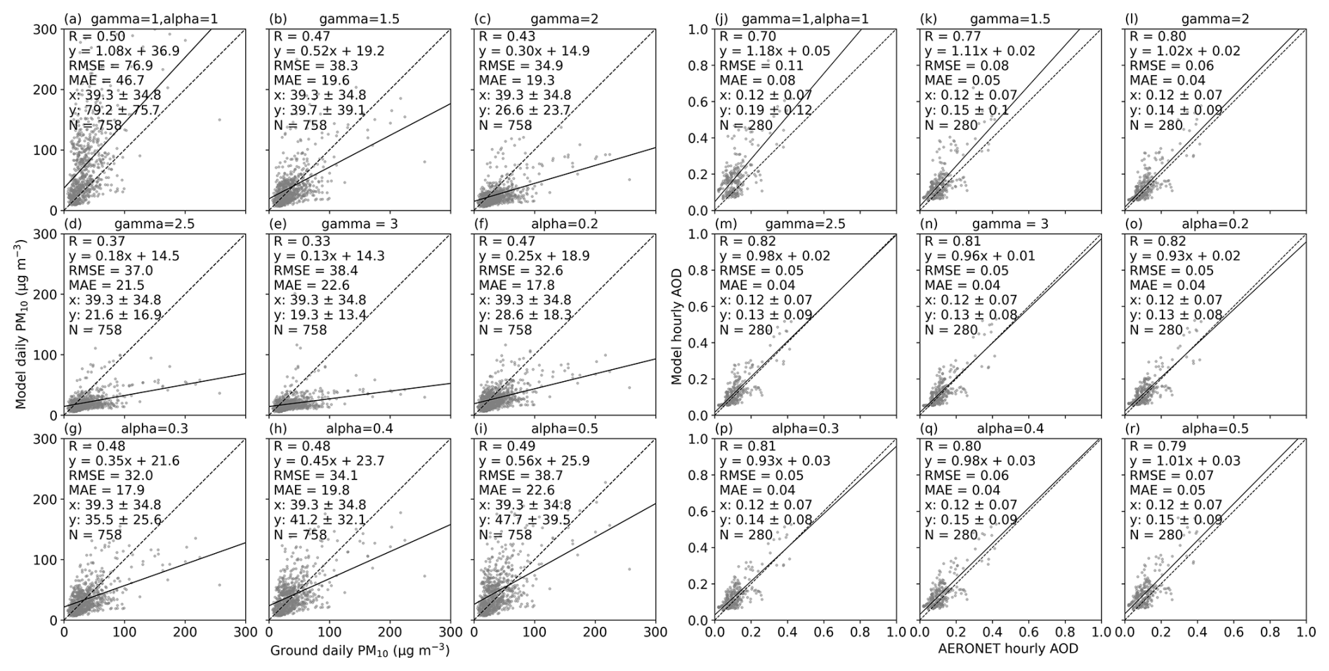 Beijing and its surrounding area in China, are affected by both local and regional emissions as well as long-range transport (Wu et al., 2021; Zhang et al., 2018). In recent decades, the North China Plain including the Beijing area has experienced severe PM pollution problems as a result of the rapid economic growth and urbanization (Zhang et al., 2016). In addition to the impacts of anthropogenic emission on surface PM levels, strong dust storms from the Taklamakan Desert and the Gobi Desert sometimes can be transported downwind to the Beijing area and affect local air quality in the springtime. Here for the CHN-Beijing target area (Fig. 2a), we first focus on a dust intrusion event during 24–31 March 2018, to study the impacts of chemical boundary conditions on surface PM. Figure 4 shows the MODIS Aqua observed AOD over part of China for the period of this event. The dust storm can be seen on 26 March 2018, at both Taklamakan and Gobi Deserts and by 28 March, strong dust clouds have been transported to Beijing and its surrounding areas. Figure S2 displays the movement of surface observations of daily PM10 mass concentration across China from 24 March to 31 March 2018. On 27 and 28 March 2018, high surface PM10 concentration were observed in Beijing, Tianjin and Hebei province with hourly concentration exceeding 1000 µg m−3 (not shown here). Then, we focus on July 2018 to study the impacts of updating land surface properties and soil NOx emission scheme on model performances.