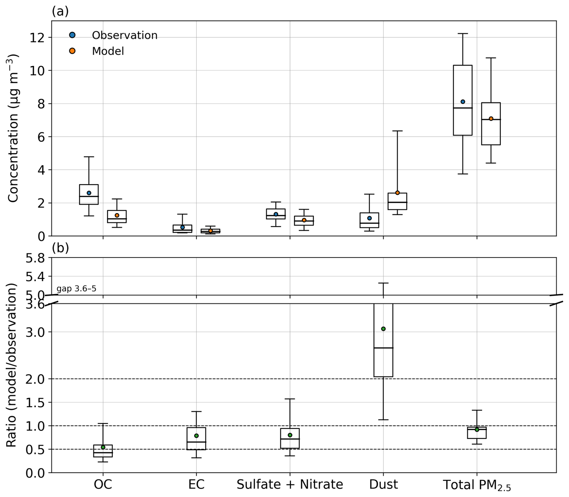 The Multi-Angle Imager for Aerosols (MAIA) satellite mission to be jointly implemented by the National Aeronautics and Space Administration (NASA) (Diner et al., 2018) and the Italian Space Agency (ASI) has a key objective to map PM composition and study the impacts of different types of PM on human health (Liu and Diner, 2017). The MAIA instrument builds upon the work of the Multi-angle Imaging SpectroRadiometer (MISR) instrument onboard NASA's Terra spacecraft, which has been retrieving aerosol properties including aerosol type since February 2000 (Diner et al., 1998; Kahn et al., 2005). MISR has also been one of the commonly used satellite instruments for mapping global PM concentration for studying air quality and public health (Liu et al., 2009; Holloway et al., 2021; Meng et al., 2018). The MAIA instrument contains a pointable 14-wavelength pushroom camera, spanning the ultraviolet (UV), visible and near-infrared (VNIR) and shortwave infrared (SWIR) regions of the electromagnetic spectrum to measure the spectral radiance of sunlight scattered by the Earth's atmosphere and surface. Three of the bands are polarimetric to further help constrain aerosol particle properties. The MAIA investigation will focus on a globally distributed set of primary target areas (PTAs) (https://maia.jpl.nasa.gov/mission/#target_areas, last access: 7 November 2025) for PM health studies, which include metropolitan cities. For each PTA, it will employ Geostatistical Regression Models (GRMs), to generate maps of surface total PM2.5, PM10 and speciated PM including sulfate, nitrate, dust, organic carbon (OC) and elemental carbon (EC). The GRMs use satellite retrieved aerosol parameters, CTM outputs (meteorological variables along with total and speciated PM mass concentrations) and other ancillary information such as population density data as predictors. Surface observations of total and speciated PM are used to train the GRMs (i.e., determine the coefficients of the model predictors) (Jin et al., 2024).