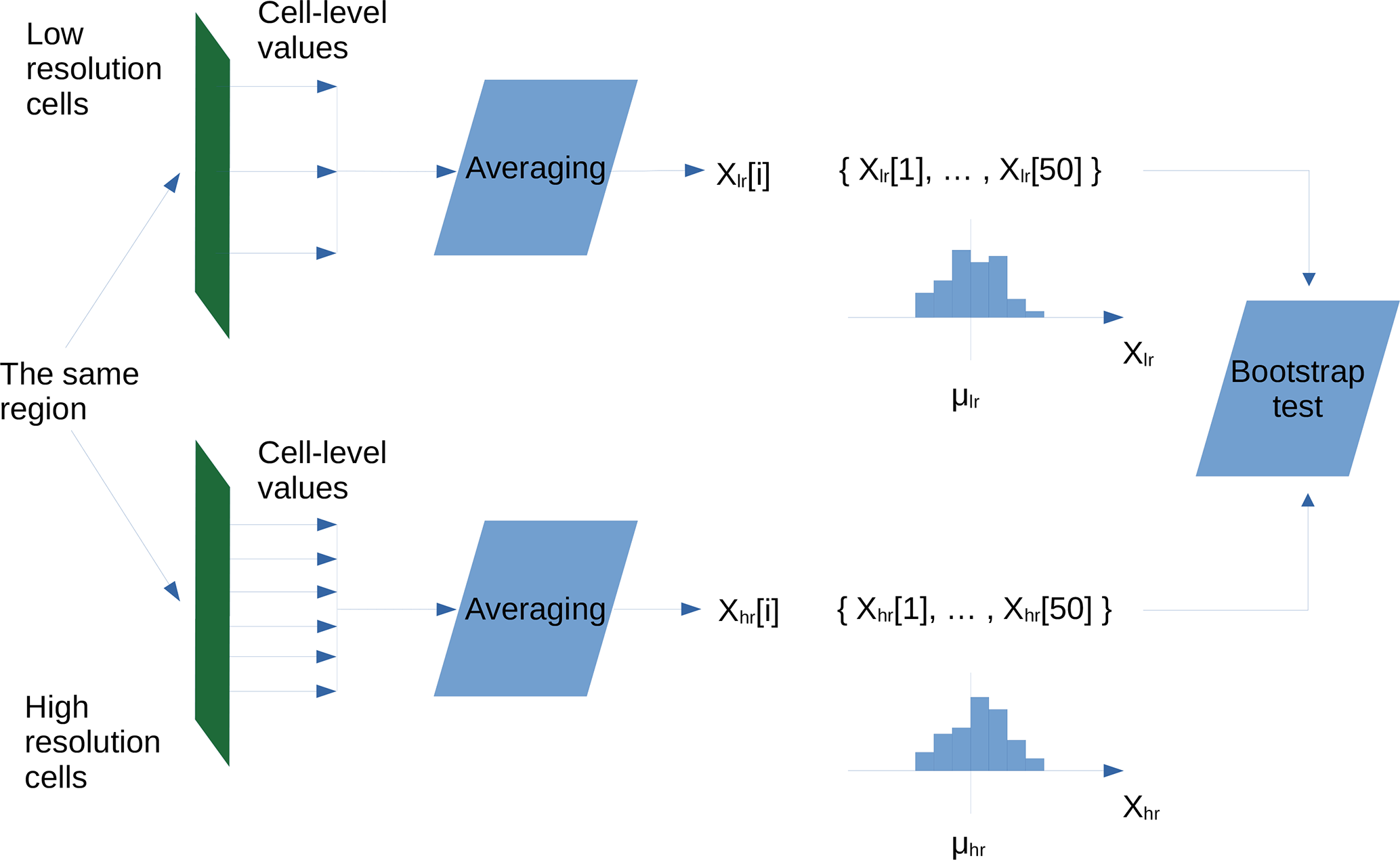 We chose this test for two reasons. First, its only restriction on the data is the existence of a finite variance, which is justified by the conservation laws of physics. On the contrary, parametric tests, such as Z-test, require assuming at least a certain distribution family, which is too constraining, as we apply the testing procedure to a number of different quantities. Also, a standard t-test cannot be used due to differences in variations of samples we obtain – the low resolution data have smaller variation than the high-resolution ones (see Sect. 4.2). Second, our data are too small to make use of the central limit theorem; see Sect. 4.1 for the setup of the experiment. In the context of studies of large regions over the historical period 1850–2014, LPJ-GUESS simulations are computationally demanding especially on the high resolution. Because of this, generating samples that contain more than 50–100 observations of averages in the Alpine region is a challenging task on both 0.5° and 0.083(3)° resolutions. When the number of observations is larger, for example in regional studies, the central limit theorem ensures convergence in law of the means of the two samples to normal distributions, and it becomes possible to use Welch's t-test (Welch, 1947) as a good alternative to the bootstrap test.