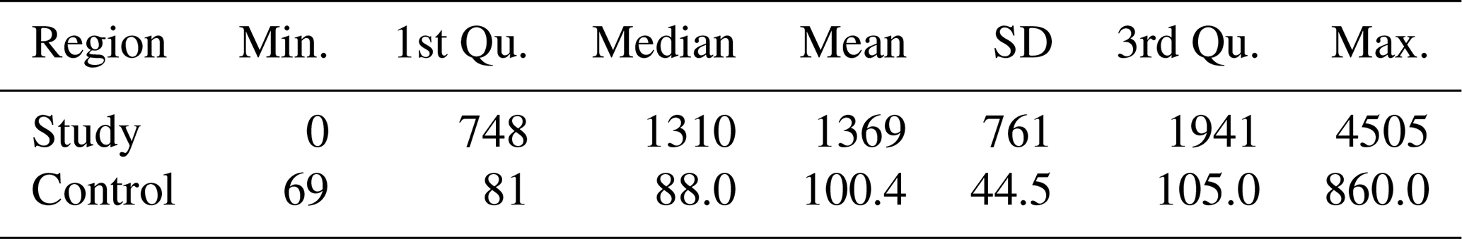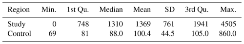 Table 2Characteristics of elevations in the study and the control regions computed using values from GMTED2010 (Danielson and Gesch, 2011). All values are in meters.