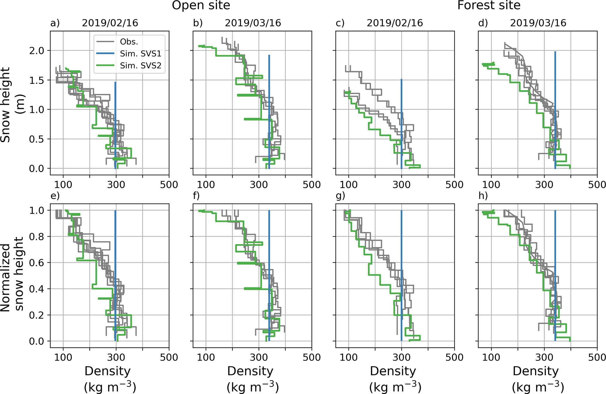In SVS2, snowpack evolution over bare ground, low vegetation, and below high vegetation is simulated with the detailed snowpack scheme Crocus (Brun et al., 1992; Vionnet et al., 2012; Lafaysse et al., 2017). When a SVS2 grid cell contains both high vegetation and open terrain, the Crocus snow model runs twice in parallel for that cell: once in open terrain with unperturbed meteorological forcing and once in forested terrain with energy and mass flux modified by the presence of high vegetation as detailed in Sect. 2.3. The implementation of Crocus within SVS2 relies on the standalone version of Crocus that has been recently developed to facilitate the use of Crocus within existing LSMs. Mazzotti et al. (2024) have used this version of Crocus to develop an hyper-resolution forest snow model.