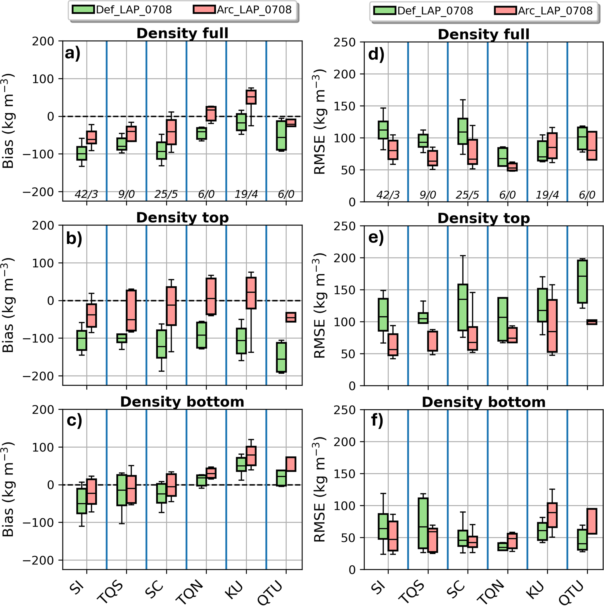 The first set of modifications made by Woolley et al. (2024) aims at increasing the compaction of surface snow due to high wind speeds. New parameterizations of snowfall density have been added following Royer et al. (2021b) and Lackner et al. (2022). These parameterizations modify the default parameterization of Vionnet et al. (2012) by increasing the effect of wind speed on falling snow density. Woolley et al. (2024) also adapted the snowdrift scheme of Crocus that simulates wind-packing, the increase in near-surface snow density during drifting and blowing snow events with or without concurrent snowfall (Brun et al., 1997; Vionnet et al., 2012, 2013). This parameterization represents the effect of surface snow fragmentation during wind-induced snow transport and the associated increase in surface snow density (Comola et al., 2017; Sommer et al., 2018). This parameterization has been initially tested in alpine terrain (Vionnet et al., 2013) but evaluations in the Arctic revealed a systematic underestimation of surface density simulated with this approach (Barrere et al., 2017; Royer et al., 2021b; Lackner et al., 2022). Changes to the snowdrift scheme in SVS2/Crocus (Woolley et al., 2024) are based on Royer et al. (2021b) and increase the maximum density of snow impacted by wind and wind-packing rate. When activated, these modifications that increase the compaction of surface snow due to high wind speeds affect simulations over the whole domain (even in regions located outside the Arctic).