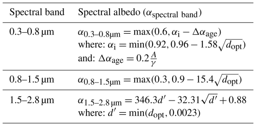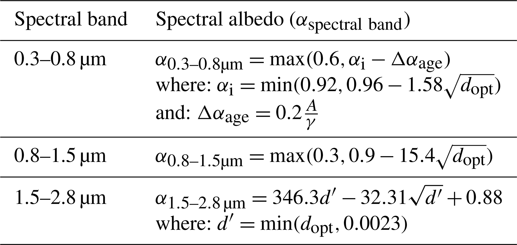 Table 1Equations representing the snow albedo for the three spectral bands in the default albedo parameterization of Crocus used in SVS2. The parameters are as follows: dopt (m) is the optical diameter of the snow, ρ is the snow density, A (days) is the age of the snow, and γ (days) is the snow darkening coefficient. Adapted from Table 4 in Vionnet et al. (2012). The pressure term present when computing Δαage in SURFEX/Crocus (Vionnet et al., 2012) is not used in SVS2/Crocus as explained in Gaillard et al. (2025).