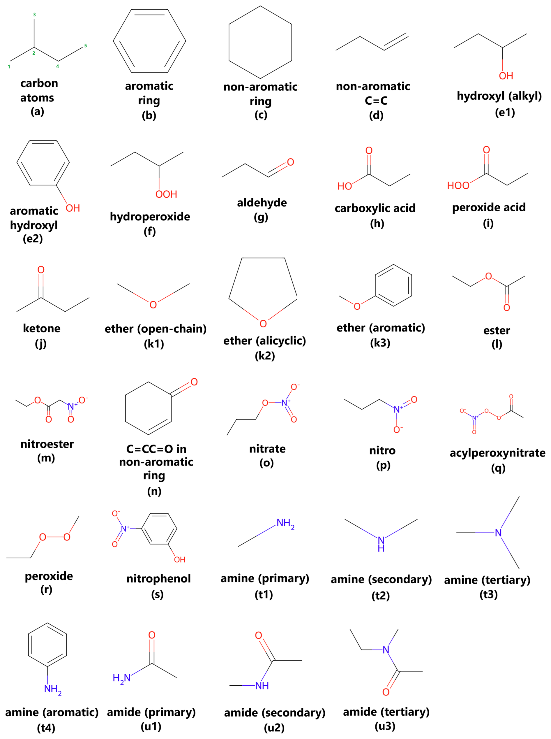 Figure 1Overview of chemical functional groups identified and analyzed by the VaPOrS, including number of (a) carbon atoms, (b) aromatic and (c) non-aromatic rings, (d) non-aromatic double bonds (C–C), (e) hydroxyl – alkyl (e1) and aromatic (e2) –, (f) hydroperoxide, (g) aldehyde, (h) carboxylic acid, (i) peroxy acid, (j) ketone, (k) ethers – open-chain (k1), alicyclic (k2), and aromatic (k3) –, (l) ester, (m) nitroester, (n) C=CC=O in non-aromatic rings, (o) nitrate, (p) nitro, (q) acylperoxynitrate, (r) peroxide, (s) nitrophenol, (t) amines – primary (t1), secondary (t2), tertiary (t3) , and aromatic (t4) –, and (u) amides – primary (u1), secondary (u2), and tertiary (u3).