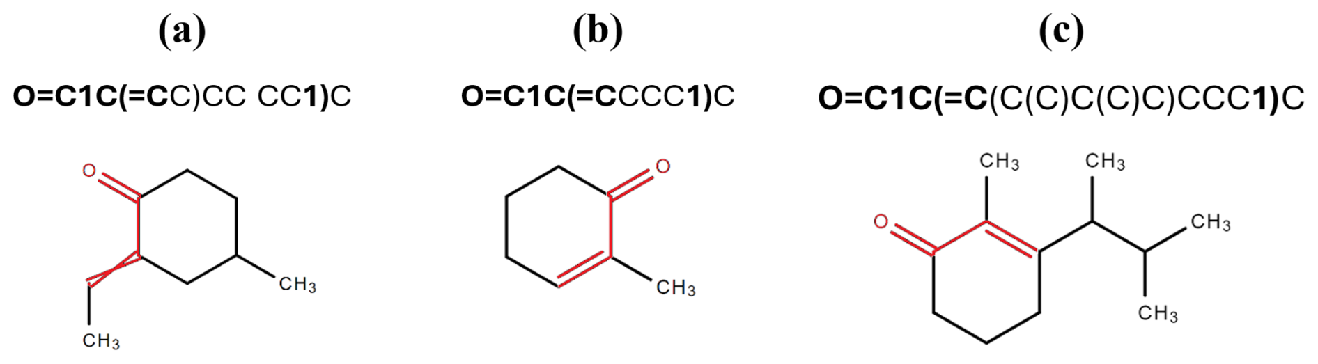 Figure 2Structural representations of SMILES strings demonstrating the importance of correct parenthesis matching for the identification of C=C−C=O groups in non-aromatic rings. Structure (a) (O=C1C(=CC)CC(CC1)C) incorrectly places the C=C bond outside the ring, while structures (b) and (c) (O=C1C(=CCCC1)C and O=C1C(=C(C(C)C(C)C)CCC1)C) adhere to the correct pattern.