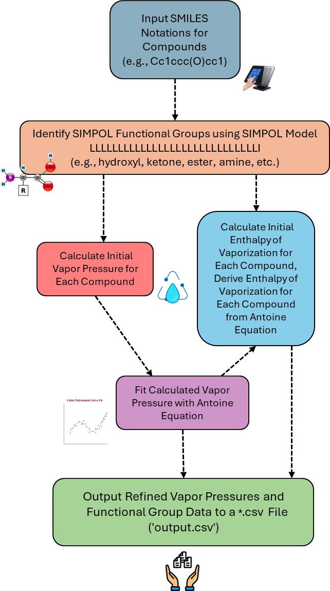 The developed VaPOrS begins by processing the SMILES notation of the target chemical compounds. SMILES strings are used as inputs to identify the molecular components most relevant to volatility predictions, such as number of carbon atoms, functional groups, and cyclic structures. Altogether 30 functional groups parameterized in the SIMPOL method are identified. Several functions are required to efficiently parse and interpret the structure of each compound. The model consists of two main parts. The first part is dedicated to identifying and counting the number of functional groups within the target while the second part focuses on calculating the saturation vapor pressure as a function of temperature and providing the corresponding Antoine equation parameters.