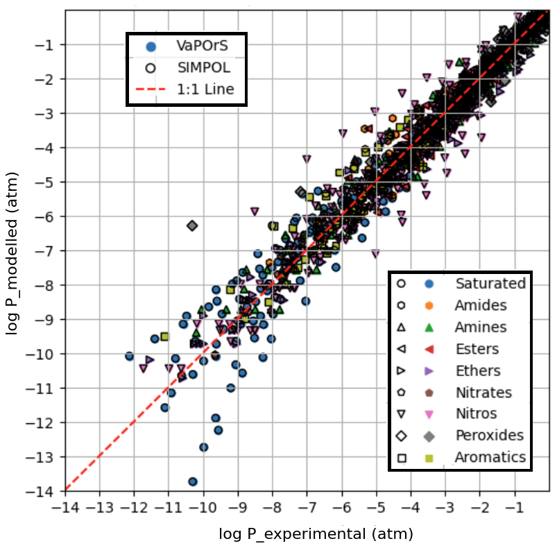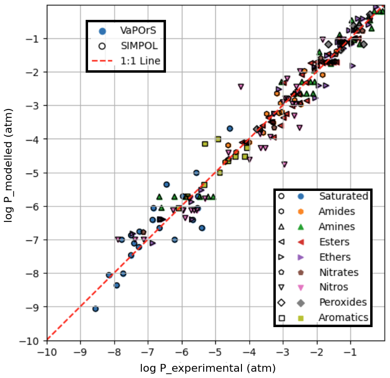 The potential applications of VaPOrS extend well beyond SIMPOL. As an instance, Pichelstorfer et al. (2024) recently introduced the auto-APRAM-fw framework for predicting the molecular structures of highly oxygenated organic molecules (HOMs) generated during autoxidation, outputting results in SMILES notation. Integrating these HOMs into atmospheric models requires both functional group identification and vapor pressure estimation, a process that becomes resource-intensive if performed manually or through non-specialized methods. VaPOrS provides an automated and efficient solution to this challenge by detecting functional groups directly from the SMILES strings and applying parameterizations such as SIMPOL for vapor pressure. More generally, the framework can facilitate integration of large molecular datasets into existing atmospheric databases and simulation platforms, advancing the predictive capability of SOA formation models. Some of the key atmospheric databases and models that could benefit from this tool are discussed in the results and discussion section.