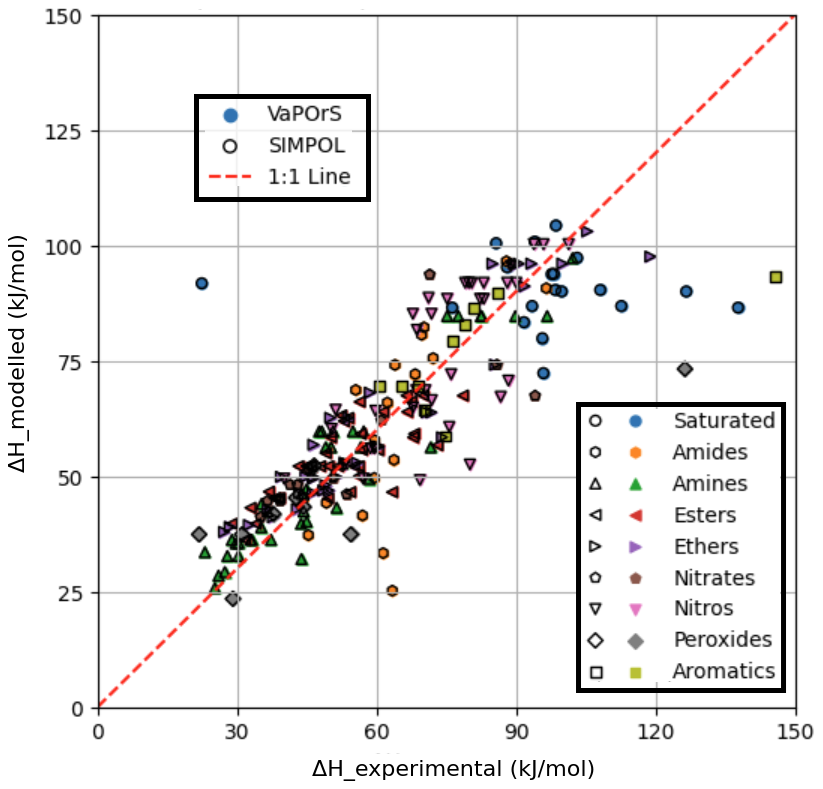 Figure 6Comparison of enthalpy of vaporization values calculated by the VaPOrS (filled symbols without edge color) and manually by SIMPOL method (symbols with no face color and black edges) against experimental measurements at 333.15 K. The diagonal line indicates the ideal 1:1 correlation, showcasing the accuracy of the models. Overlapping symbols are observed, with black-edged SIMPOL markers obscuring the filled VaPOrS symbols.