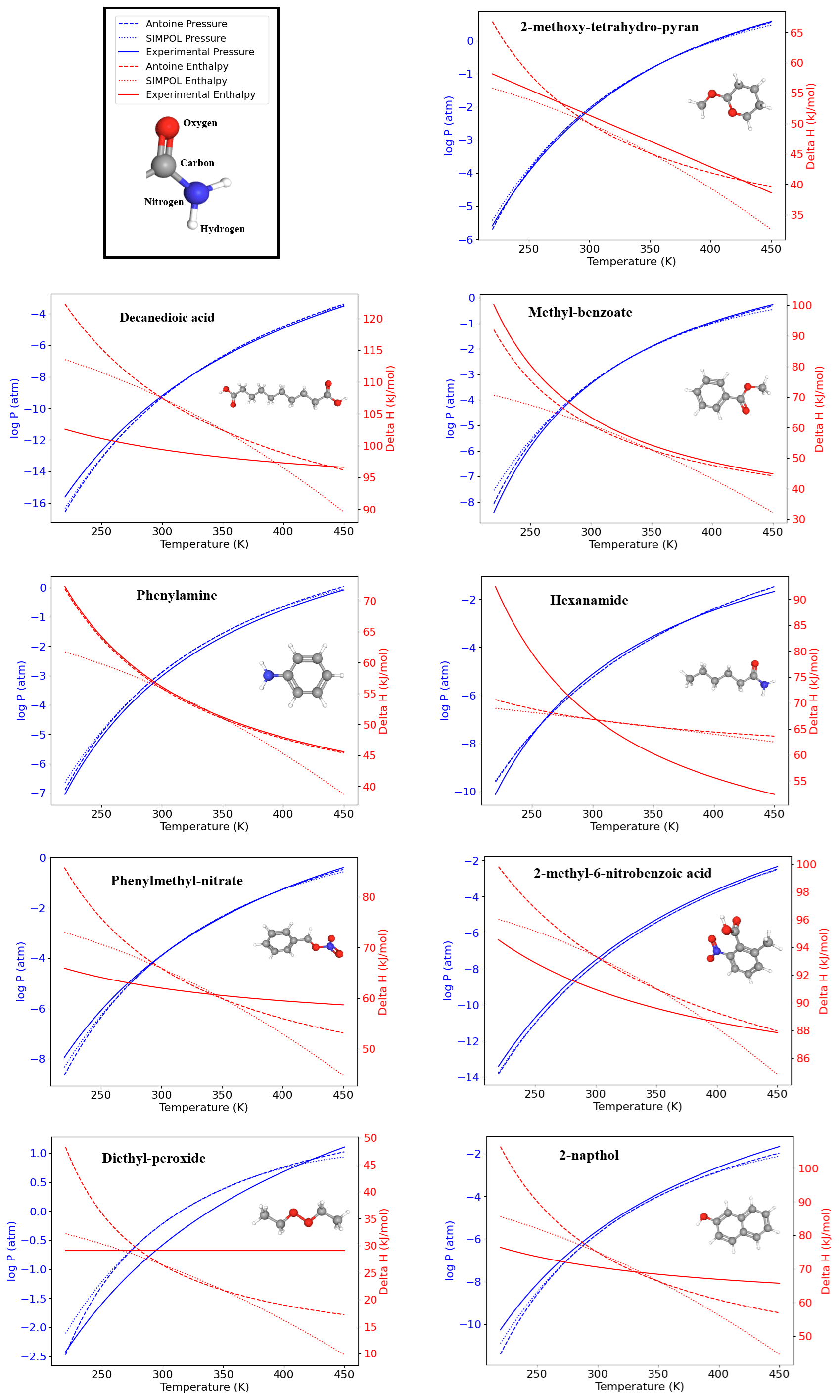 Given the limitations of experimental approaches, there is an obvious need for computational tools that can predict these properties efficiently. Such tools can complement experimental methods by providing rapid estimates for a wide range of compounds, facilitating large-scale atmospheric modeling studies. Various computational methods have been developed to estimate the saturation vapor pressure of organic compounds, complementing or replacing traditional experimental approaches. Among these, predictive models like COSMO-RS (COnductor-like Screening MOdel for Real Solvents) use quantum chemistry calculations to estimate thermodynamic properties, including saturation vapor pressure. COSMO-RS simulates the solvent environment and molecular interactions, providing a theoretical basis for property estimation. However, its computational intensity can be a drawback for large-scale applications (Klamt, 1995; Eckert and Klamt, 2004; Klamt et al., 1998). On the other hand, group contribution methods estimate saturation vapor pressure based on the contribution of structural groups within a molecule. These methods leverage empirical correlations derived from extensive datasets but often lack precision for complex or highly functionalized molecules (Joback and Reid, 1987; Myrdal and Yalkowsky, 1997). The Nannoolal method is a computational approach used to estimate the boiling points and saturation vapor pressures of organic compounds based on their molecular structure. This method utilizes group contribution techniques, where the overall properties of a molecule are determined by summing the contributions of its individual structural groups, such as functional groups and bonding patterns (Nannoolal et al., 2008). The EVAPORATION method is a tool designed for estimating the saturation vapor pressure of organic molecules, accounting for contributions from the carbon skeleton, functional groups, and their interactions, and it adjusts for functionalized diacids with empirical modifications. It predicts the saturation vapor pressure of various compounds using only molecular structure as input, making it applicable to a wide range of molecules (Compernolle et al., 2011). The SIMPOL method, developed by Pankow and Asher (2008), is a widely used group contribution method that correlates the presence of specific functional groups in a molecule to its vapor pressure. By summing the contributions of individual functional groups, the method provides an estimate of the compound's vapor pressure. The SIMPOL method has been validated against experimental data and is recognized for its accuracy and applicability to a wide range of organic compounds. Importantly, since all these methods employ group contribution techniques, they could potentially be integrated into automated tools, enabling the efficient handling of large datasets and complex compounds with minimal manual effort.