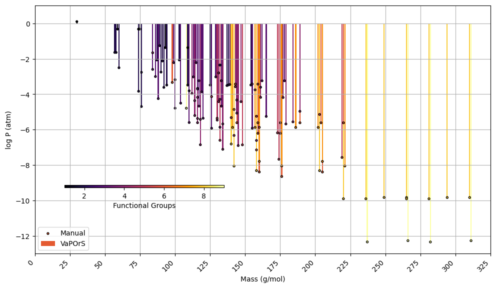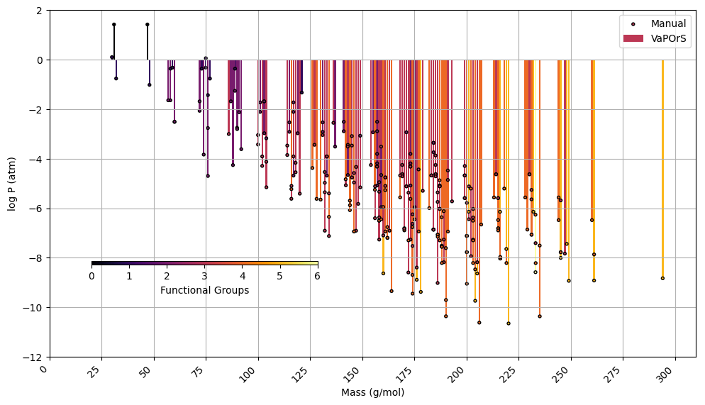 Figure 10 demonstrates the saturation vapor pressures achieved through the VaPOrS and compares them with their manually calculated counterparts. Automated results are shown as colorful bars based on the number of detected functional groups reaching as high as 15 for some autoAPRAMfw products, and manual results are depicted as points. The compatibility of points atop bars for each species indicates excellent agreement between both approaches.