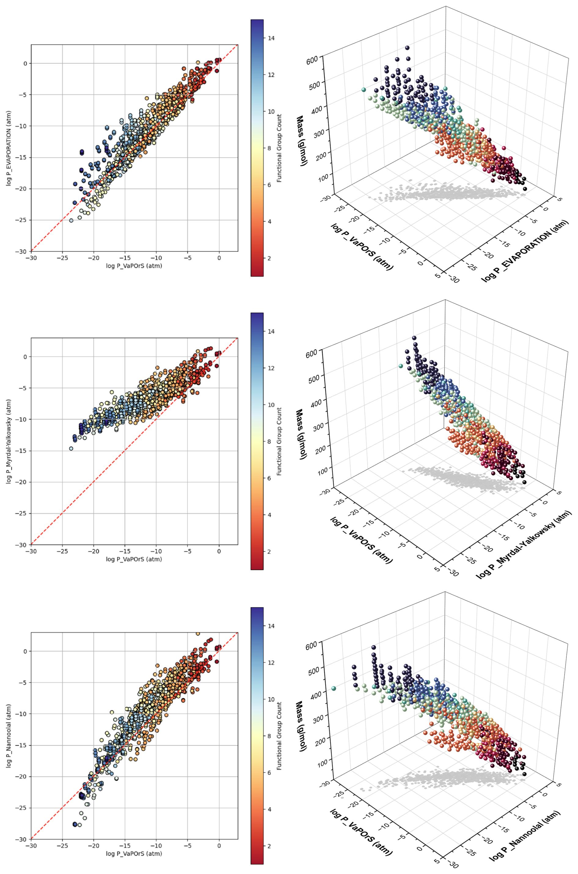 Figure 11Comparison of logarithmic saturation vapor pressures at 298.15 K predicted by the VaPOrS model (log P_VaPOrS) with those from the EVAPORATION (log P_EVAPORATION), Nannoolal (log P_Nannoolal), and Myrdal–Yalkowsky (log P_Myrdal_Yalkowsky) methods for autoxidation products derived from benzene degradation. Each data point represents a compound, with color indicating the functional group count. The red dashed line in the 2D plots represents the theoretical 1:1 relationship, where predictions from VaPOrS and other methods would be equivalent. The 3D plots include molar mass variation as well to give a comprehensive view of relationships between the parameters.