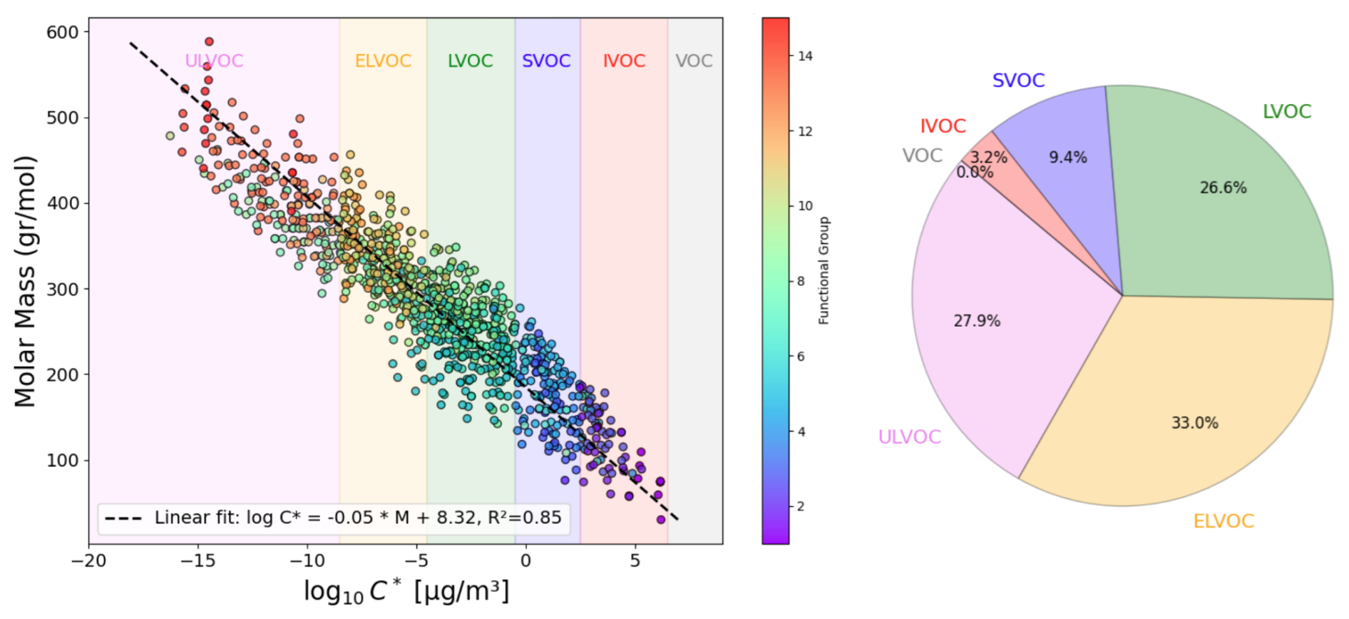 Figure 12 presents the relationship between molar mass and effective saturation concentration for these products. Oxidation products from the MCM and autoxidation products from autoAPPRAM-fw were both introduced into the VaPOrS framework to calculate their saturation concentrations at 298.15 K. Each data point corresponds to an individual compound. The regression line highlights a strong negative correlation between molar mass and vapor pressure, indicating that molecular growth shifts compounds toward the low-volatility regime. The inset pie chart shows the molar-mass-weighted distribution across volatility classes, underlining the prevalence of ELVOC and ULVOC species. These results demonstrate that autoxidation significantly enhances the formation of low-volatility vapors, which play a key role in SOA formation.