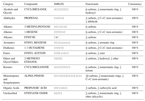 In the first step, a dataset of 126 primary VOCs sourced from the Master Chemical Mechanism (MCM) database are evaluated. While the MCM database provides detailed chemical mechanisms for atmospheric chemistry, its coverage of primary organic compounds is relatively limited compared to the vast diversity of VOCs present in the atmosphere. Nonetheless, it serves as a valuable resource for validation, given its detailed representation of key compounds. Notably, the MCM database not only provides the structures of these compounds but also includes their corresponding SMILES notation, facilitating an accurate assessment of functional group presence through the VaPOrS method. The current version of the MCM (v3.3.1) can be obtained as the file mcm_3-3-1_species_complete.tsv from the MCM archive page (https://www.mcm.york.ac.uk/MCM/about/archive, last access: 20 November 2025).