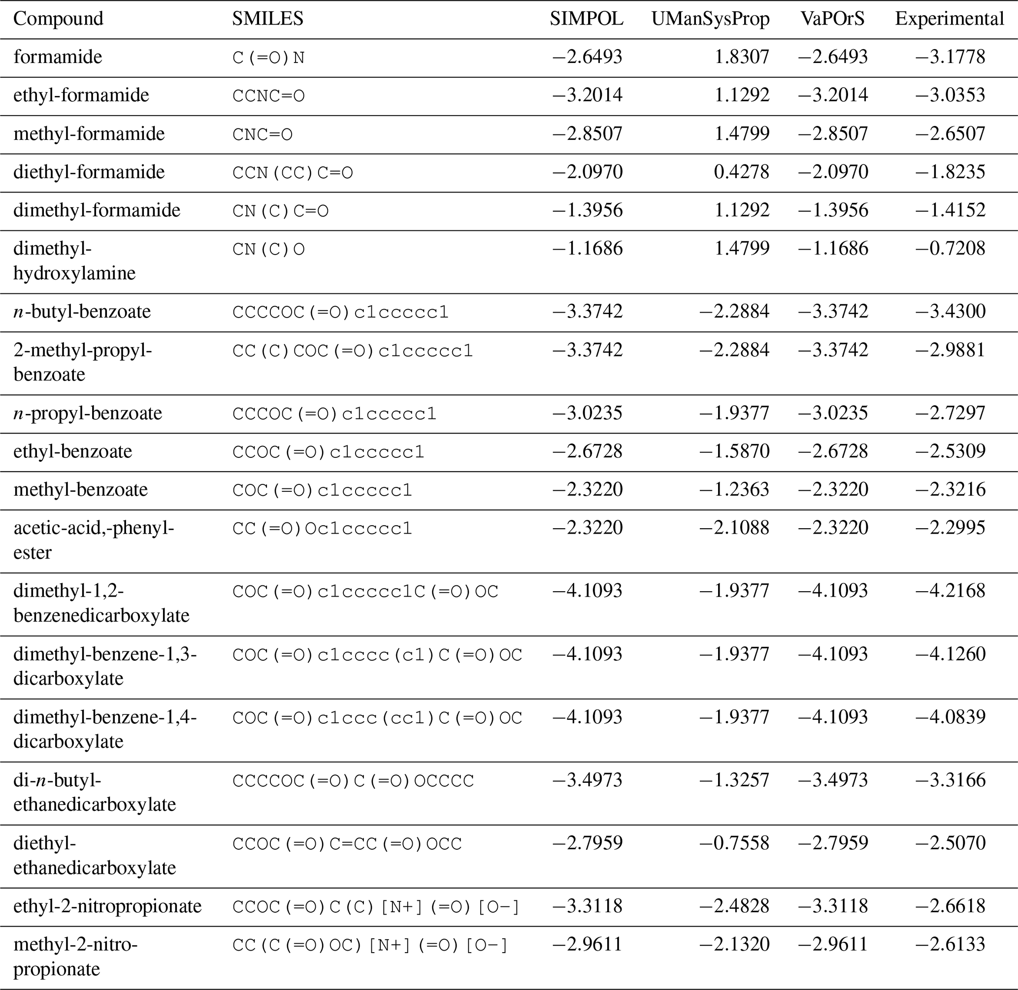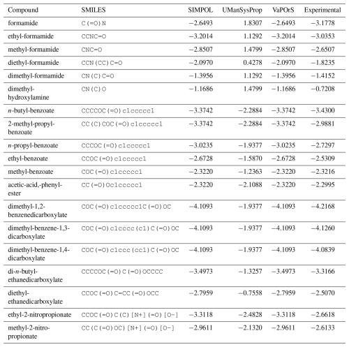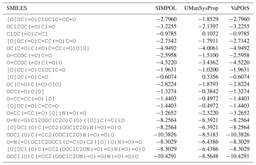 Table 2Benchmark of UManSysProp and VaPOrS against the original SIMPOL compounds from Pankow and Asher (2008). Several functional groups critical for vapor pressure estimation were missed by UManSysProp, resulting in deviations from SIMPOL values. VaPOrS accurately reproduced SIMPOL predictions in all cases. All vapor pressure values are expressed as log p (in atm) at 333.15 K.