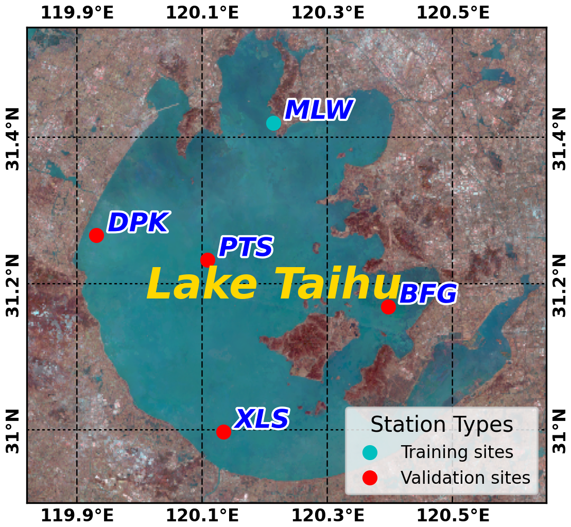 Table 1Overview of selected lake sites in Lake Taihu, including their geographic coordinates, observation start dates, biological characteristics, and roles in model development. The MLW site was used for model training, while the remaining sites served for validation.