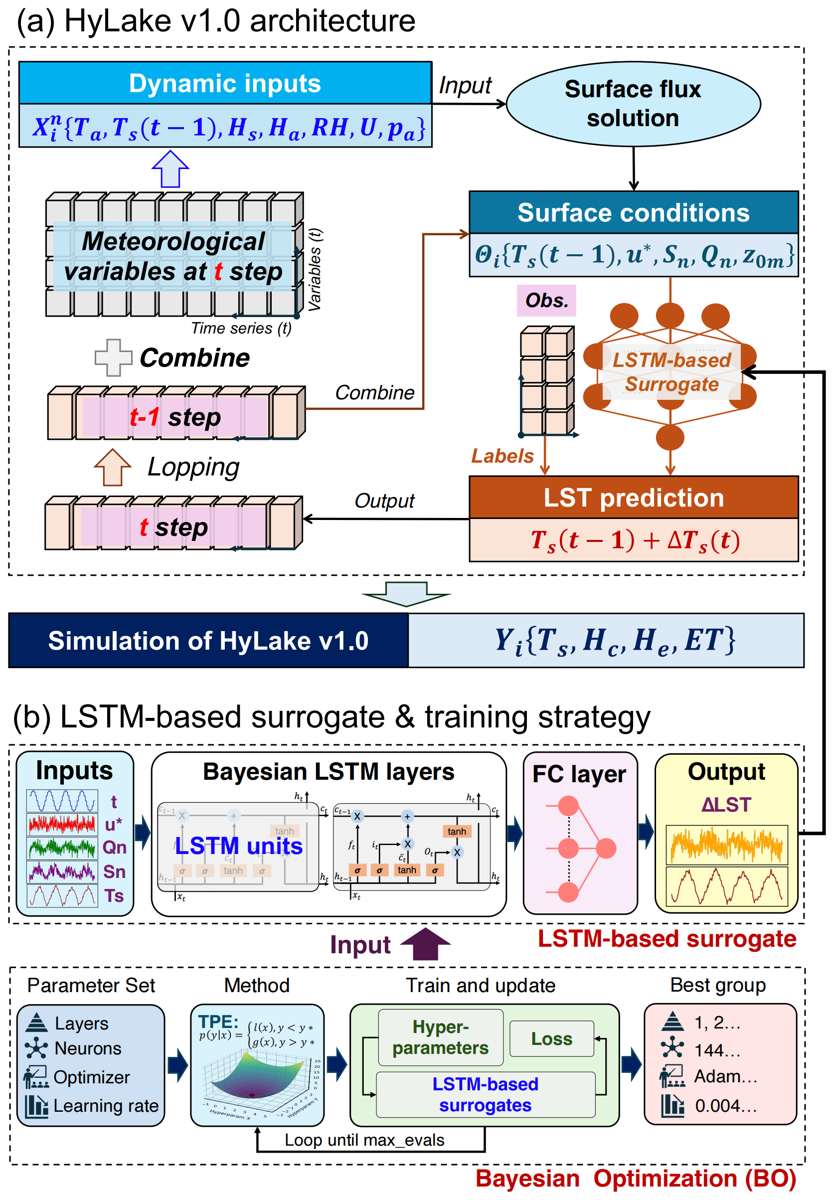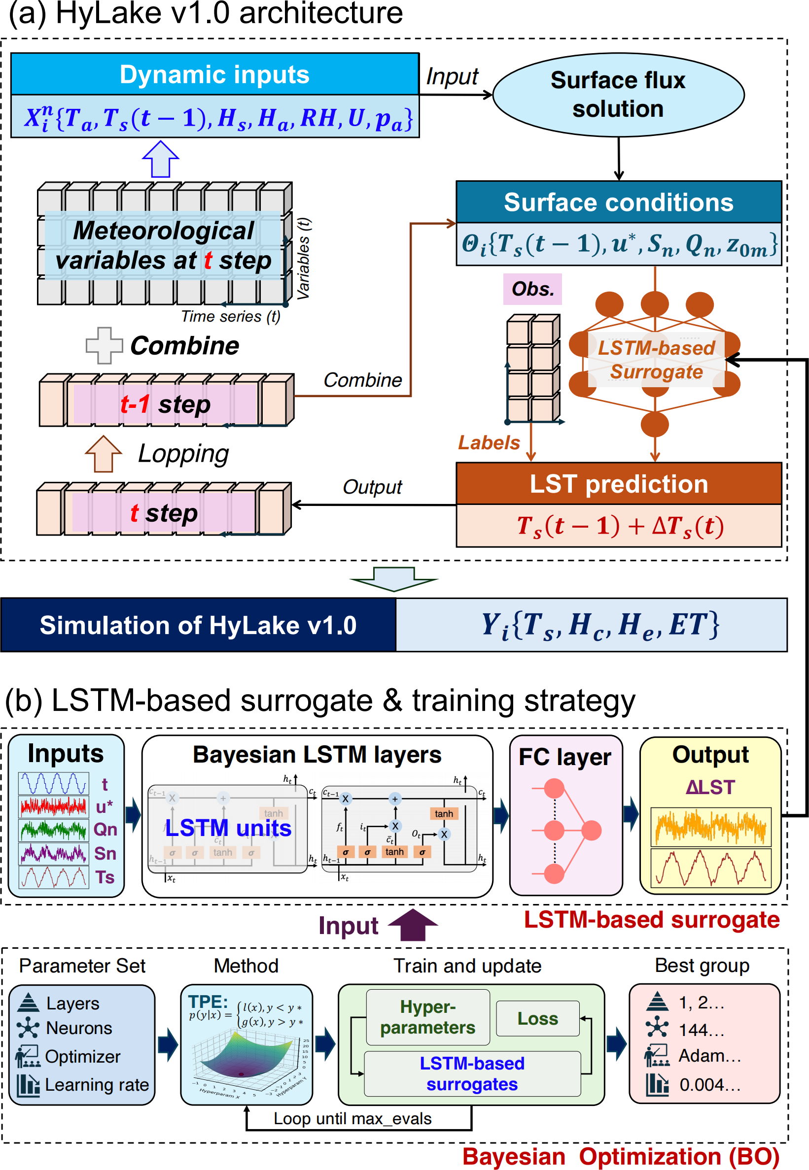HyLake v1.0 is based on the backbone of physical principles from process-based lake models and then couple to a LSTM-based surrogate for LST approximation to further solve the untrained variables (e.g., LE, HE), as schematically shown in Fig. 2. The following sections will introduce the architecture of HyLake v1.0 from the physical principles, LSTM-based surrogates and their training strategies, respectively.