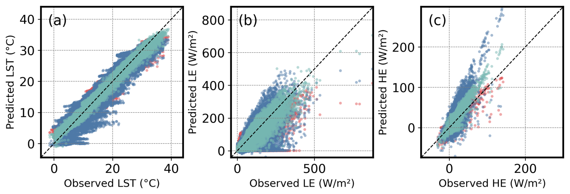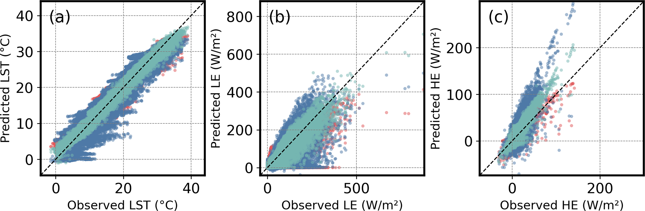Figure 5Comparison of predicted (a) LST, (b) LE and (c) HE by using FLake (red points), Baseline (blue points), HyLake v1.0 (green points) and observations in MLW experiments.