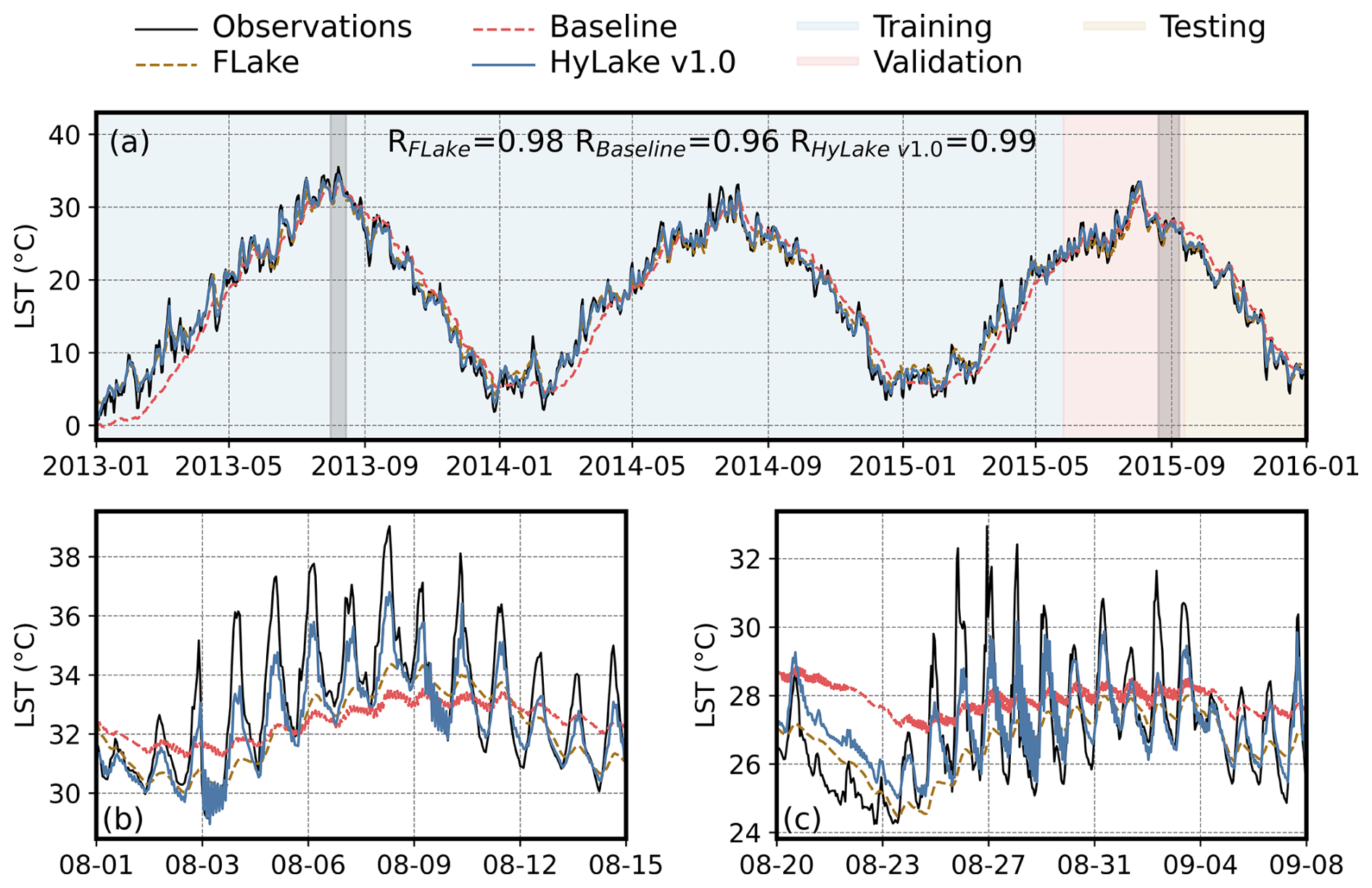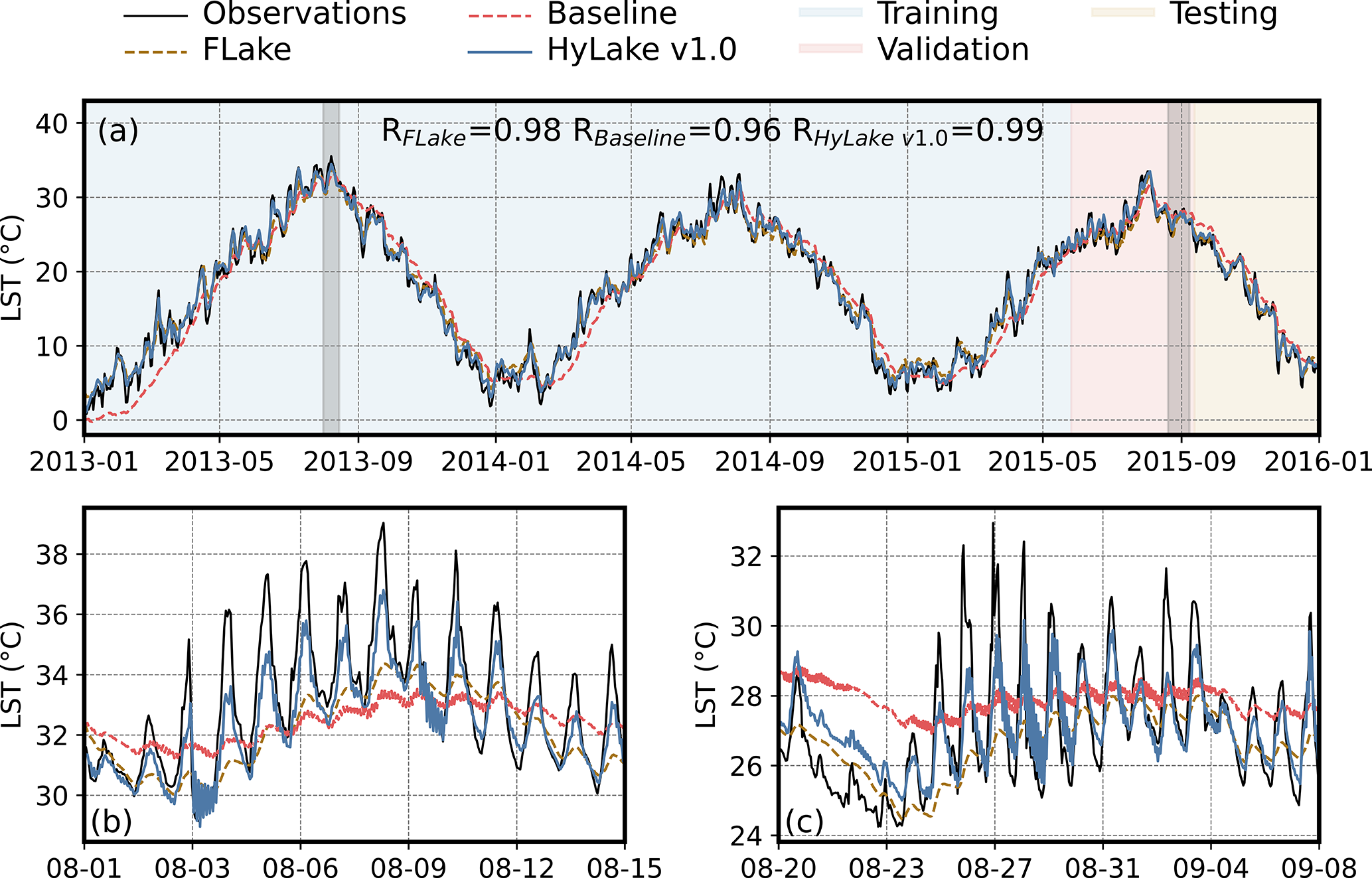 As shown in Fig. 6, the temporal changes in LST for the period of surrogates training (1 January 2013 00:00:00 to 26 May 2015 04:00:00 UTC+08:00), validation (26 May 2015 04:00:00 to 12 September 2015 14:00:00 UTC+08:00), and test datasets (12 September 2015 14:00:00 to 30 December 2015 23:00:00 UTC+08:00) were compared. For daily changes in LST, HyLake v1.0 and FLake showed a closer match to observations, whereas Baseline, trained with process-based simulations, exhibited a larger error in comparison to the observed values (R= 0.96, RMSE = 2.71 °C, Fig. 6a). HyLake v1.0 demonstrated a greater capability in capturing the daily changes in LST, particularly in mid-winter for each dataset, thus indicating long-term stability in LST modeling (R= 0.99, RMSE = 1.08 °C, Fig. 6a). Specifically, FLake provided a good match to observations at a daily-average scale, which, however, showed poorer performance in capturing diurnal variations of LST (R= 0.98, RMSE = 1.76 °C, Fig. 6a). This study randomly selected two subperiods from the training, validation, and test periods (Fig. 6b and c), where the diurnal variations of LST observations exhibited a significant bias compared to FLake, indicating that FLake is not able to accurately describe variations at the diurnal scale. Meanwhile, Baseline primarily captured the long-term trends of LST from PBBM but did not effectively represent diurnal variations due to the limitations of the datasets and physical principles provided by PBBM. In contrast, HyLake v1.0 was able to capture more information about the diurnal variations of LST from the observations, thereby outperforming both FLake and Baseline. Overall, HyLake v1.0, coupled with the BO-BLSTM-based surrogates trained on observations, offers a robust way for predicting LST trends at a finer temporal resolution.