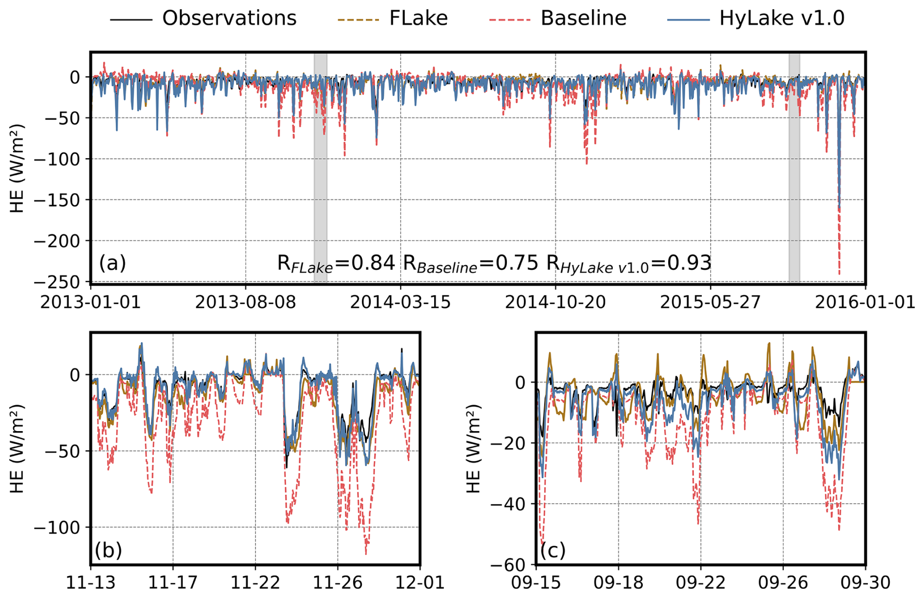 Figure 8Comparisons of observations and predictions by FLake, Baseline, and HyLake v1.0 in temporal trends for HE. Comparison of (a) full and (b–c) partial time series of model derived HE and observations from 2013 to 2015.