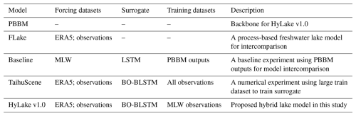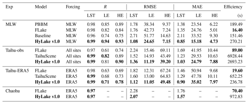Table 3Intercomparison of model performance across different experiments conducted in diverse regions with different forcing datasets. Observations from all lake sites (MLW, DPK, BFG, XLS, and PTS) on Lake Taihu, were used to drive models in the Taihu-obs experiment. Bold values in the table present the best-performing model with each group of experiments. Computational efficiency is reported as the runtime for a single simulation.