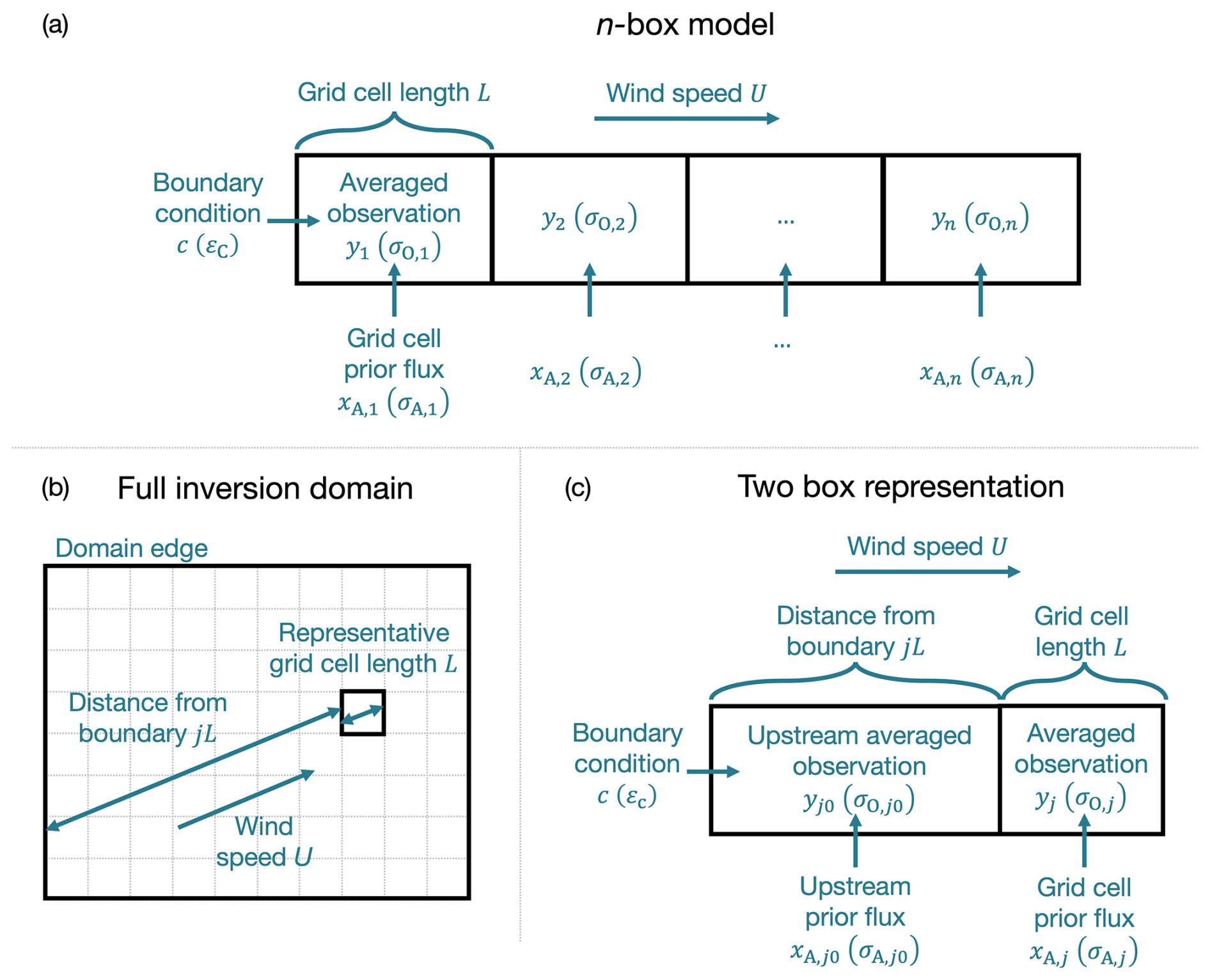 Figure 1One-dimensional and two-box models of a passive trace gas to quantify the influence of BCs on inverse analyses. The one-dimensional model (a) simulates the concentrations of an inert trace gas over n grid cells of length L given a prescribed BC c, fluxes x=[x1,x2,,xn]T, and advection with wind speed U. The two-box model (c) generalizes an inverse analysis optimizing fluxes over a two-dimensional grid (b) where all grid cells have a representative grid cell length L given the wind direction. Each grid cell in the domain is reduced to a two-box model composed of a cluster of the j upwind grid cells (index j0) and the grid cell itself (index j). In all models, the inversion is solved with the averaged observation yi over each grid cell i={1,,n} with corresponding error standard deviation σO,i. The inversion is regularized by the prior flux xA,i in each grid cell with corresponding prior error standard deviation σA,i.