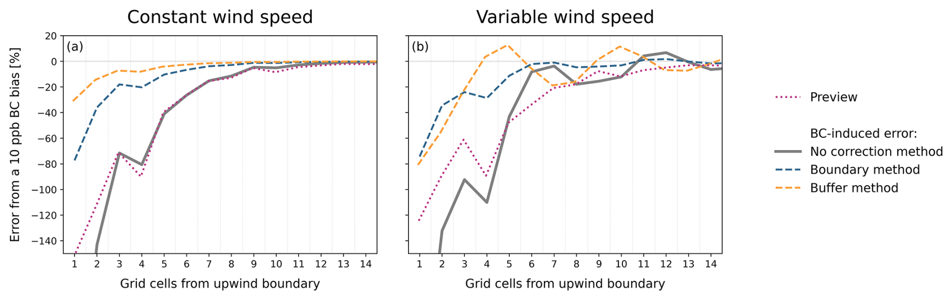 Figure 3a shows the relative difference in the posterior fluxes, normalized by the prior fluxes, induced by a constant 10 ppb BC perturbation for an inversion with constant wind speeds. As expected from our theoretical analysis, the resulting error on average decreases as the distance from the upwind boundary increases. Exceptions to the decreasing trend result from normalizing by the prior fluxes. The preview (Eq. 12) accurately predicts the error as expected from the specification of the wind speed. The diagnostic (Eq. 5; not shown) perfectly quantifies the no correction method error as expected given the specification of the BC bias.