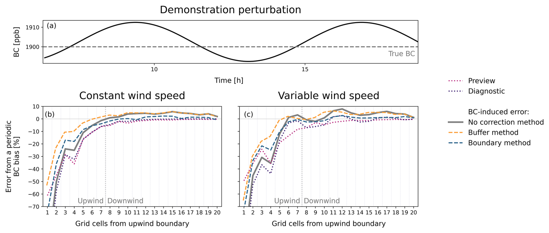 Figure 4 shows the relative difference in the posterior fluxes, normalized by the prior fluxes, induced by a demonstration periodic perturbation with mean bias of 4 ppb over the inversion period (panel a and Sect. S3) for inversions with constant and varying wind speeds (panels b and c, respectively). The upwind biases are controlled by the mean bias with the error on average decreasing with the distance from the upwind boundary. The preview and diagnostic (Eqs. 13 and 5, respectively), which are calculated using the mean bias, capture these biases. The diagnostic also captures the downwind biases attributable to transport. Similarly, both correction methods decrease the upwind bias. The boundary method achieves modest error reductions because the BC-induced error is of similar magnitude to the error generated by the loss of information content due to the BC optimization. Downwind biases are only decreased by the boundary method when three or more BC elements are optimized.