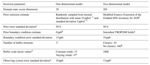 a The error covariance matrices are assumed diagonal. b We optimize an incremental correction to the BC. c We optimize one buffer element that is a cluster of three native-resolution grid cells. d The buffer scale factor is the factor p applied to the prior error standard deviation in the buffer grid cell. e We calculate the buffer scale factor with Eq. (9). f We increase the Express Extension of the Gridded EPA inventory for 2020 (Maasakkers et al., 2023) by a factor of three so that the prior error statistics are consistent with the true emissions. g We use the IMI default boundary conditions, which are given by monthly mean TROPOMI observations smoothed over ≈1000 km. h We take as the inversion buffer zone the five concentric rings of 0.25°×0.3125° grid cells around the outer edge of the domain. We solve inversions using 10 buffer cluster elements and 440 native resolution buffer grid cells. i The IMI assumes a constant error standard deviation of 15 ppb for all observations aggregated into errors for the averaged observations accounting for error correlations following Chen et al. (2023). We use the errors generated by the IMI directly.