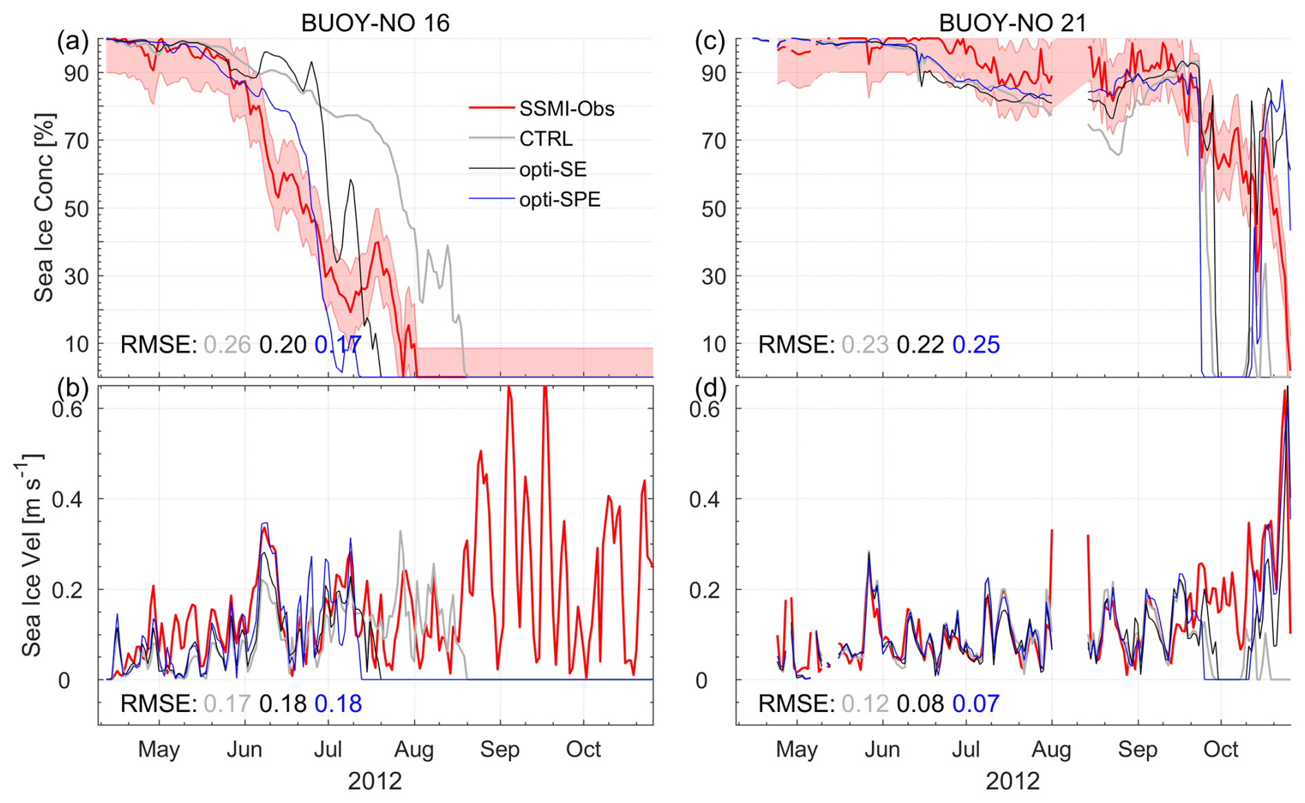 The sea ice extent in 2012 reached the unprecedentedly low values since the satellite era. The ULSs of three moorings observed ice-free conditions from August to October. The control run fails to simulate the ice-free conditions, while both opti-SE and opti-SPE successfully reproduce the seasonal SIC variation (Fig. 7a–c). opti-SPE shows smaller RMSE at Mb and Md than opti-SE and CTRL (see the numbers in Fig. 7b, c). In opti-SPE, a pack ice broke off from the main ice field from 20 July to early August and gradually melted at Ma, resulting in slightly larger RMSEs (Fig. 7a).