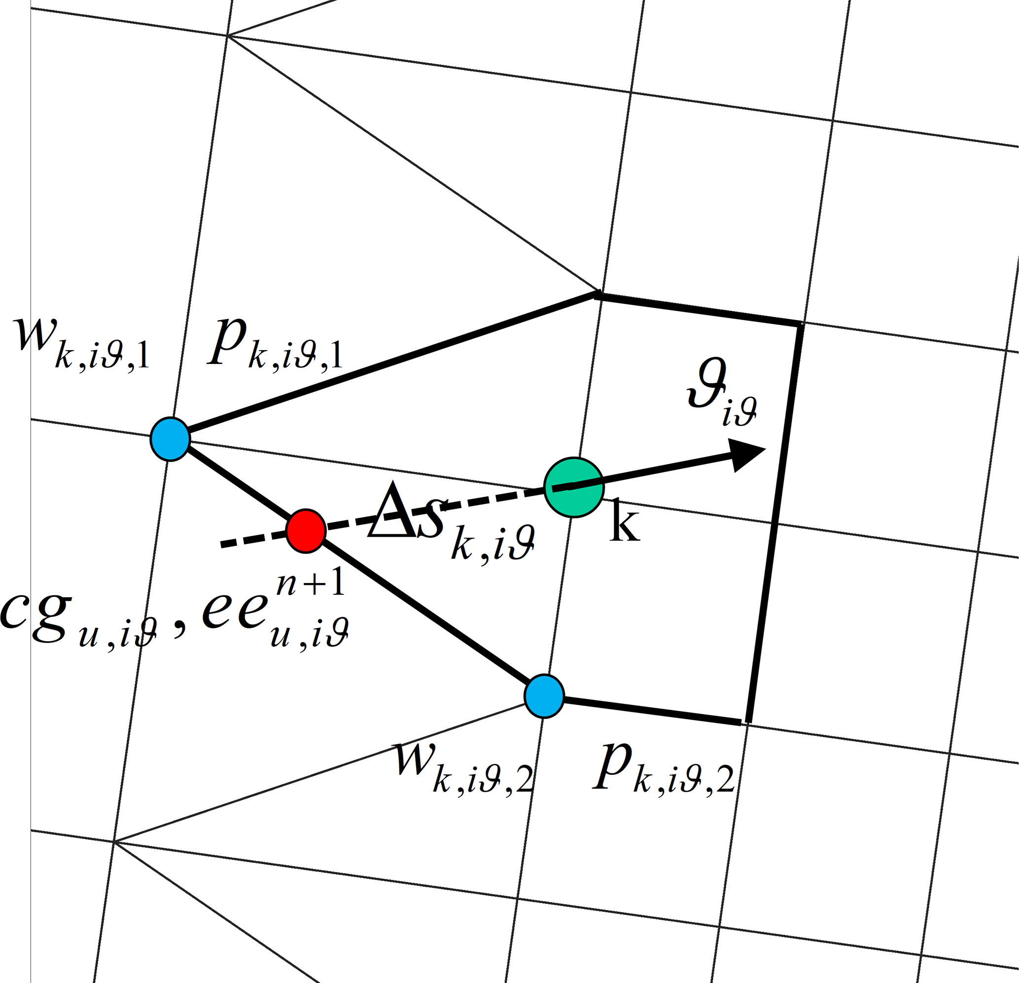 where k is the grid node number, iϑ the direction bin number and n the timestep/iteration number. The subscript u refers to the point upwind of grid point k, as illustrated in Fig. 1; values for cg and ee in this point are obtained from the two points p, which are upwind from point k for directional bin iϑ, and with weights w that depend linearly on the distance between the upwind point and the two adjacent points p.