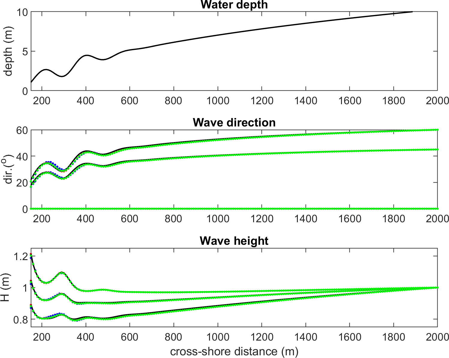 A first test of the correct implementation of refraction and shoaling is to compare the wave height and mean wave direction over a longshore uniform, double barred profile. We use an analytical representation of typical Dutch barred profiles (Bakker, 2013):