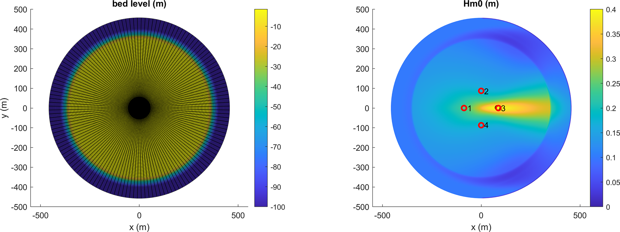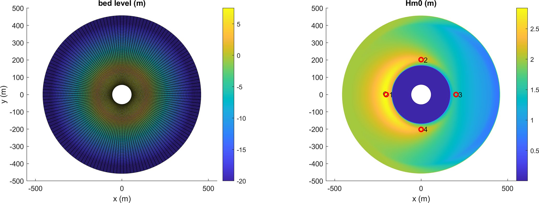 Figure 3Circular island test. Left panel: bathymetry and computational grid. Right panel: wave height Hm0 distribution. Points 1–4 correspond to locations of directional distributions.