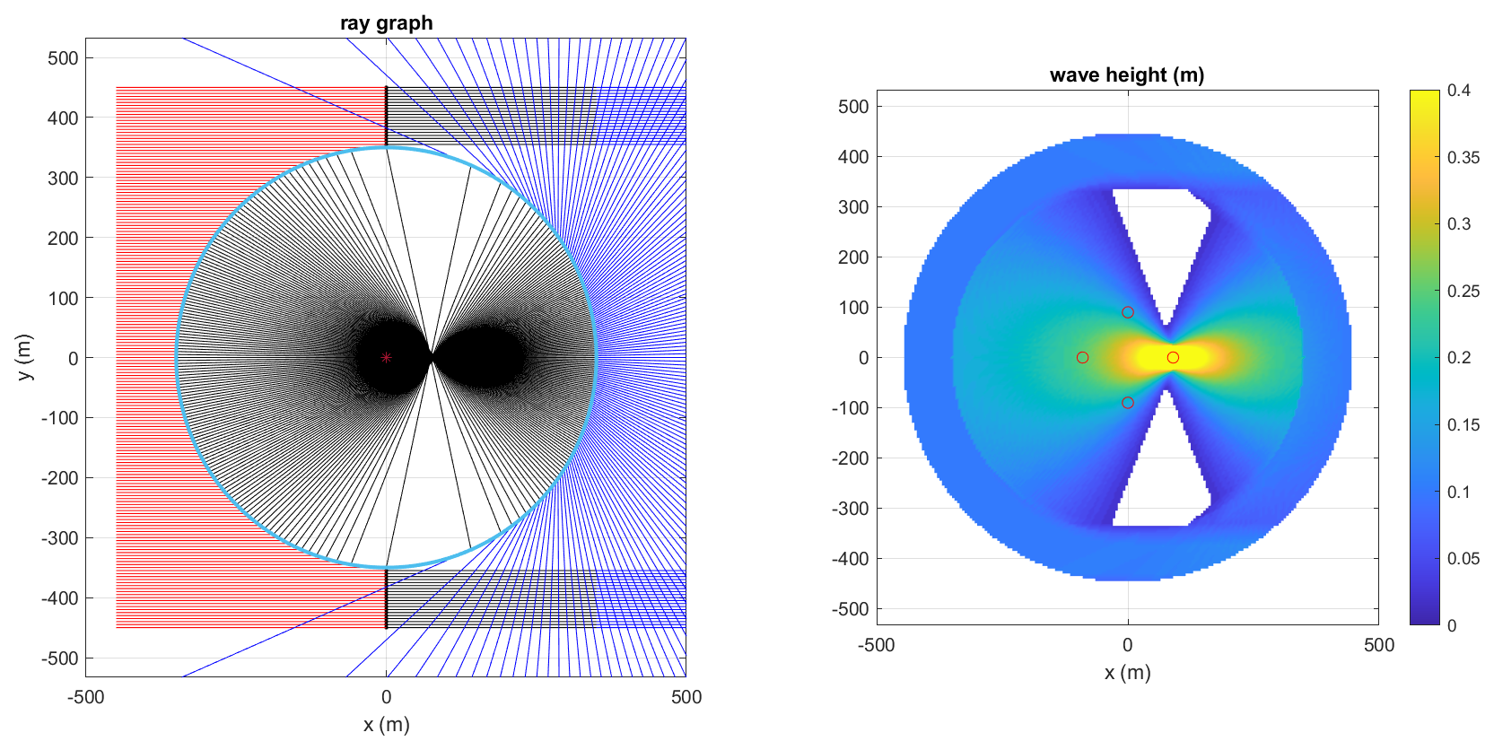 To be able to compare our model with the analytical solution in terms of wave height distribution, we reproduced the wave ray refraction pattern as described in Mandlier and Kench (2012) and added the computation of wave heights, by counting the number of wave rays passing within a certain distance, taken as 4.5 times the initial ray distance, from each grid point in a regular 5 m by 5 m grid, and computing the wave height as the rms value of the wave heights associated with each refracted wave ray within this distance. The incident wave height was 0.1 m, ensuring wave breaking did not play a role. The resulting refraction pattern and wave height distribution are shown in Fig. 5, showing a highly concentrated wave height region around 90 m East of the centre of the reef, and two areas of very low or undetermined wave heights where the wave rays cannot reach.