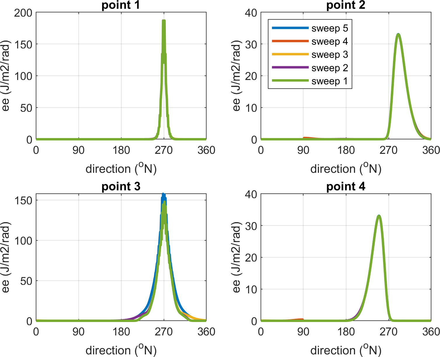 The building up of the solution is almost complete in the first sweep, for points 1, 2 and 3. For points 2 and 4 the fourth, East to West sweep brings some additional energy peak from almost easterly direction, due to refractive trapping along the edge of the reef. In any case it is symmetrical and relatively small.