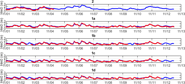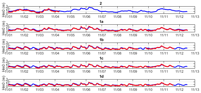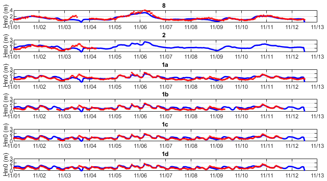 Figure 10Time series of Hm0 wave height at 30 min intervals, measured (red dots) vs computed (drawn blue line). Local model driven by observed wave conditions at 15 m depth, γ = 0.7.