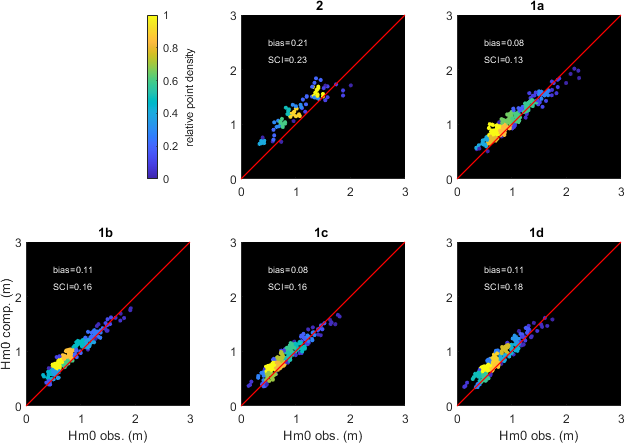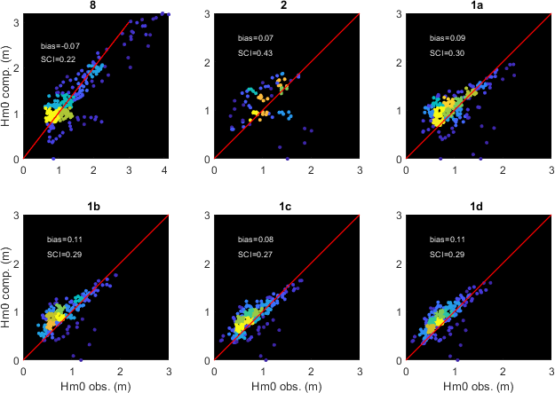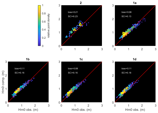 Figure 27Scatterplots (heat maps) of computed vs. observed Hm0 wave heights. Large-scale model. For color legend refer to Fig. 11.