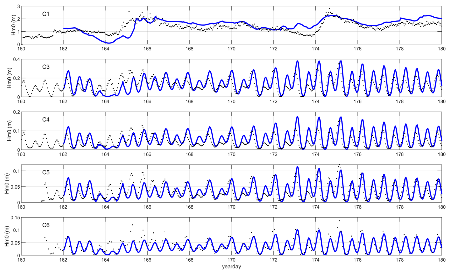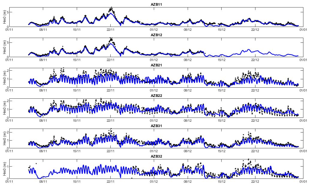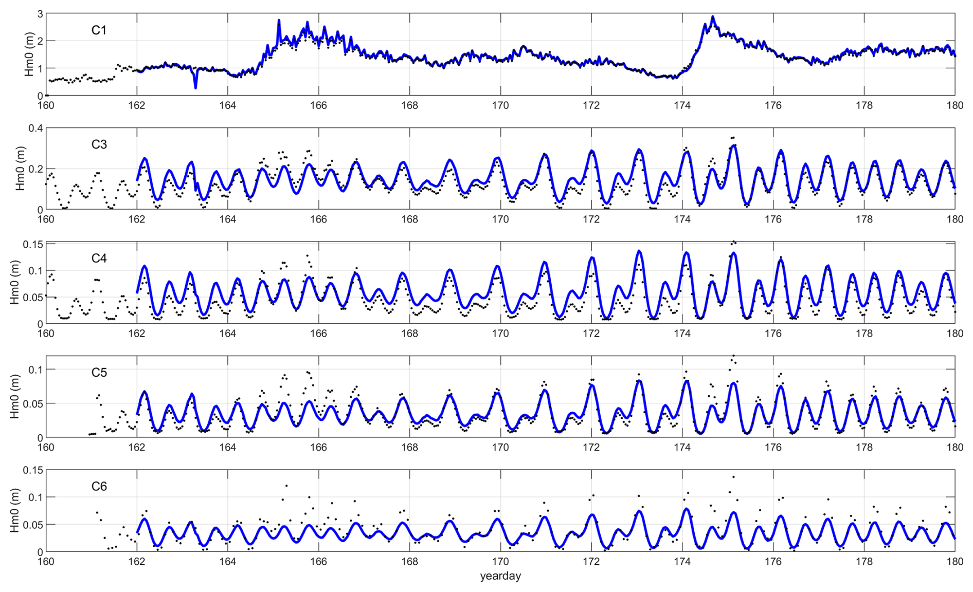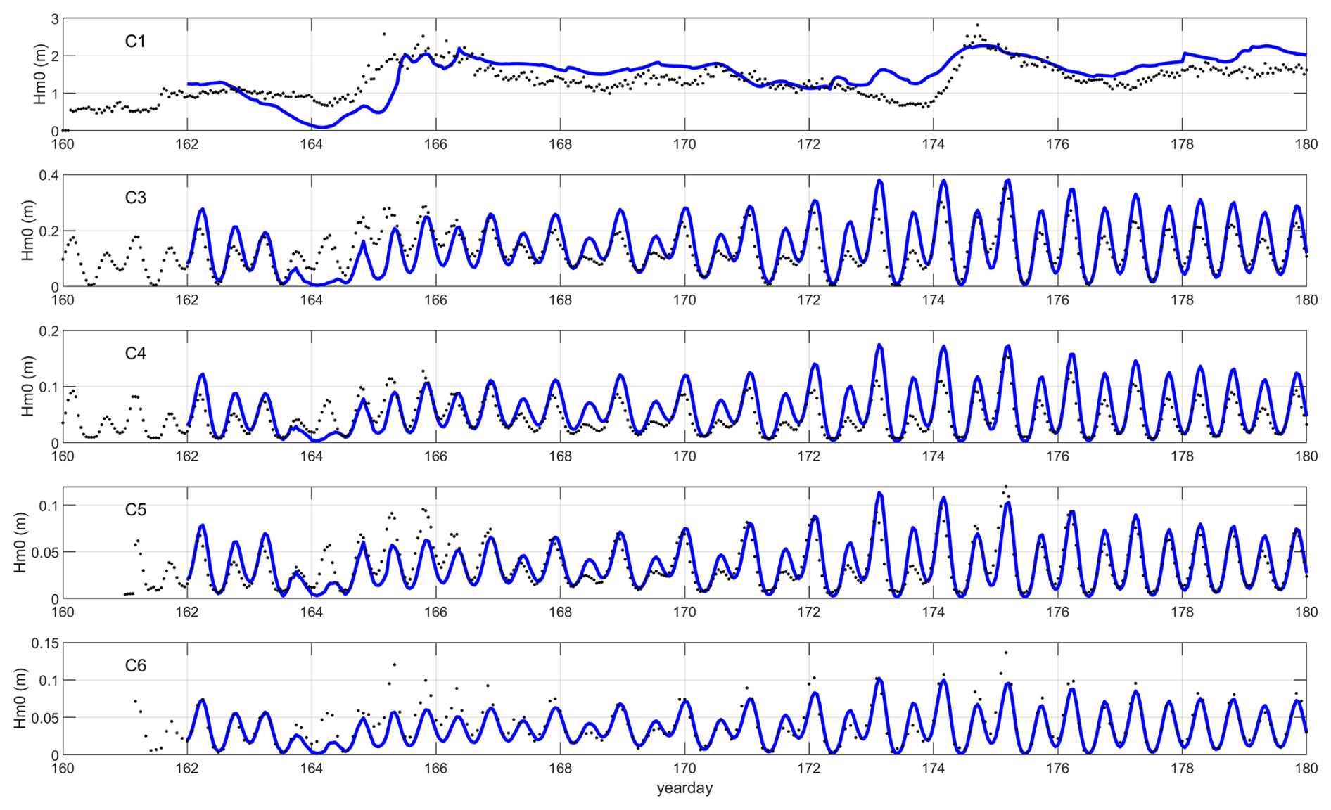 Figure 26Time series of HM0 wave height across the reef at Ningaloo; observations (black dots) against model simulation (blue drawn lines). Large-scale model.