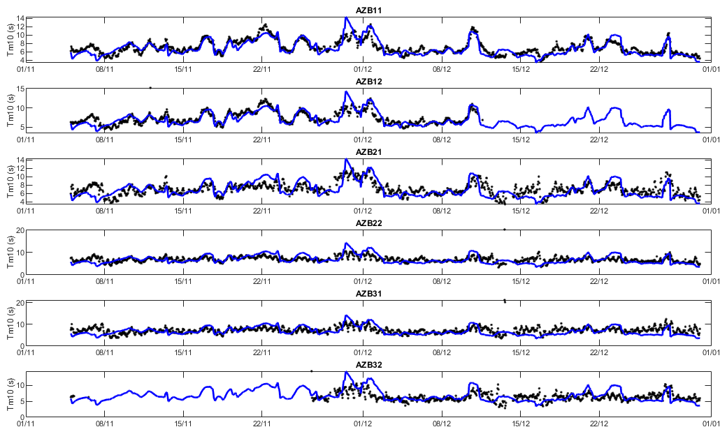 Time series for Hm0 wave height are shown in Fig. 16. Clearly, the points AZB11 and AZB12 are in depths where the tidal modulation does not play a role yet, and generally the computed wave heights follow the measurements closely, except for the event around 22/11 where the wave height is clearly underestimated. This is likely due to an underestimation of wave heights by ERA5 for this event, though some additional wave growth due to wind (not included in this SnapWave model) could play a role as well.