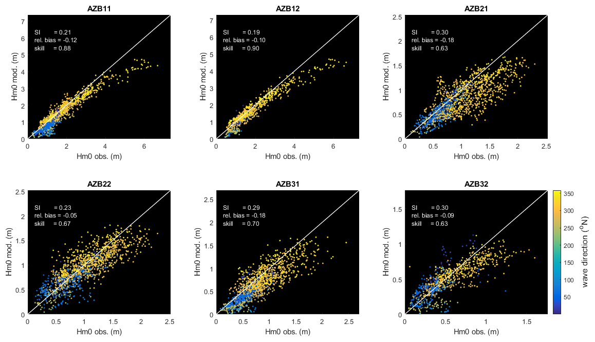 The scatterplots in Fig. 18 confirm that the systematic underestimation of the higher wave heights originates with the ERA5 data and propagates through the nearshore area. The scatter in the nearshore points is rather consistent at around 30 %. According the used definition, the model skill is consistently over 0.9, indicating an adequate performance for such cases.