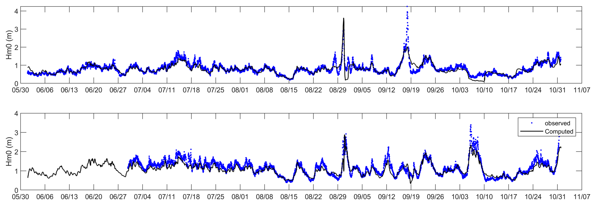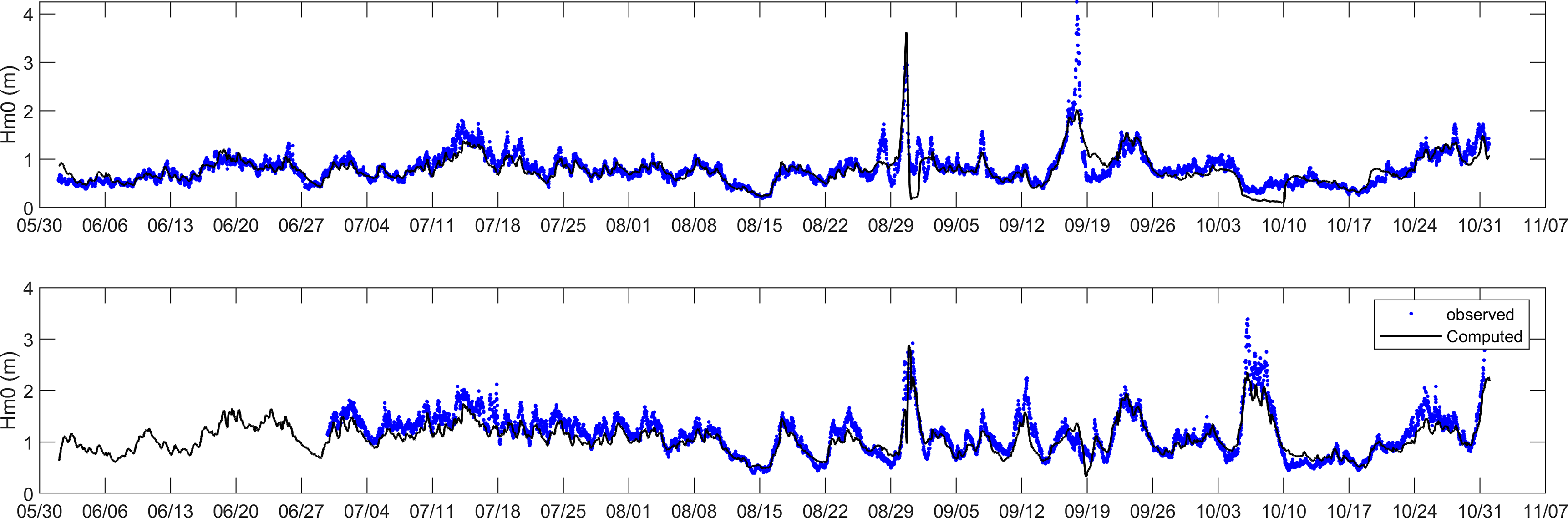 The time series of the large-scale model simulation are shown in Fig. 12. First, as an indication of the quality of the ERA5 hindcast, the observations at the point 8 at 15 m water depth are generally reproduced quite well, except for a small event at 3 November, which is completely missed by ERA5; during that period, both wave directions and wind directions are offshore in ERA5 so there is no possibility of getting such nearshore wave heights in the order of 2 m. The other peaks are generally predicted well, sometimes with a phase shift in the order of a few hours.