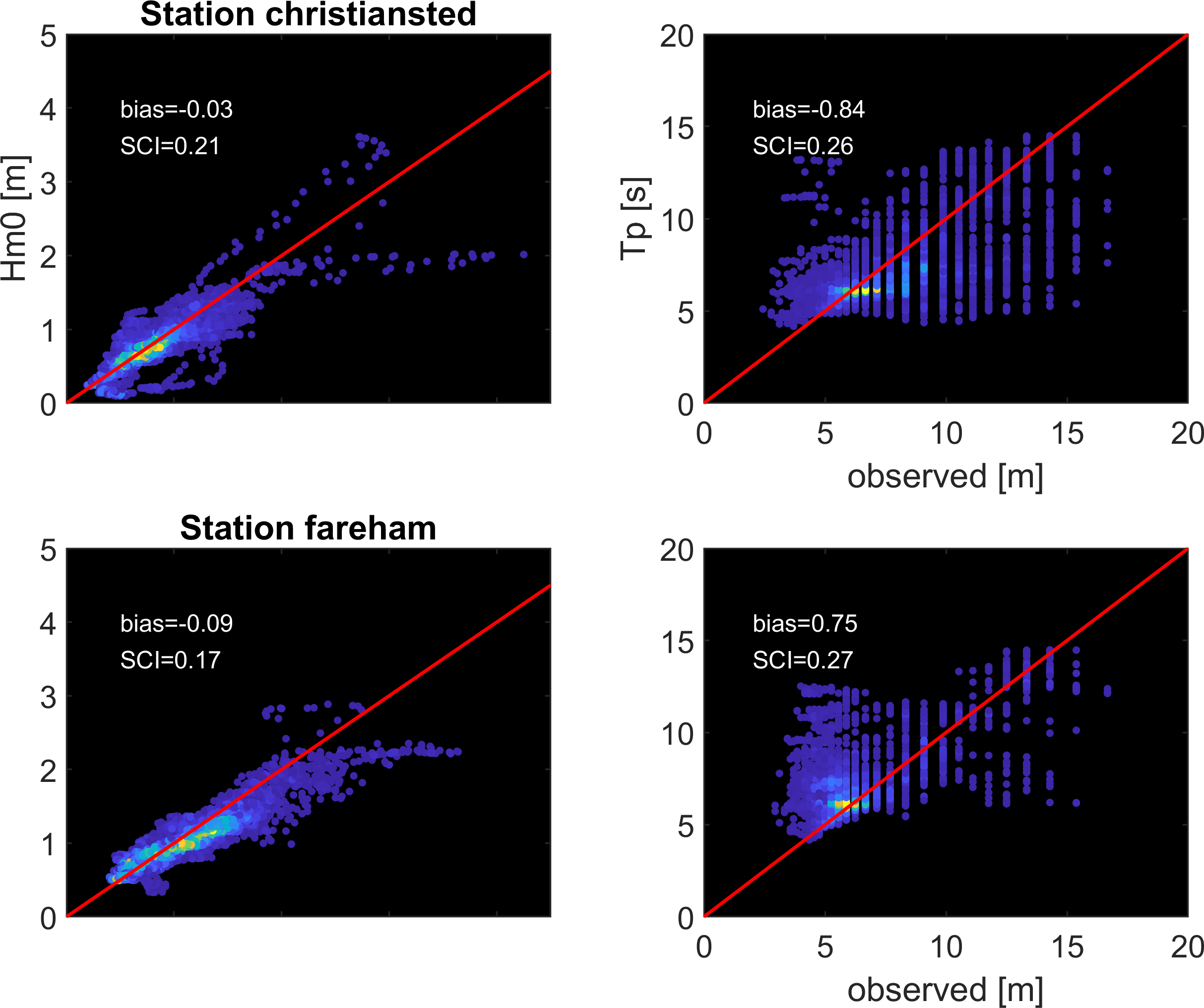 The scatterplots (heat maps) confirm the fact that for most conditions the agreement is quite good, and only for some individual events the ERA5 model misses the peaks. Overall, as is also apparent from the error statistics, the bias is less than 10 % and the scatter index in the order of 20 %, and skill over 95 %.